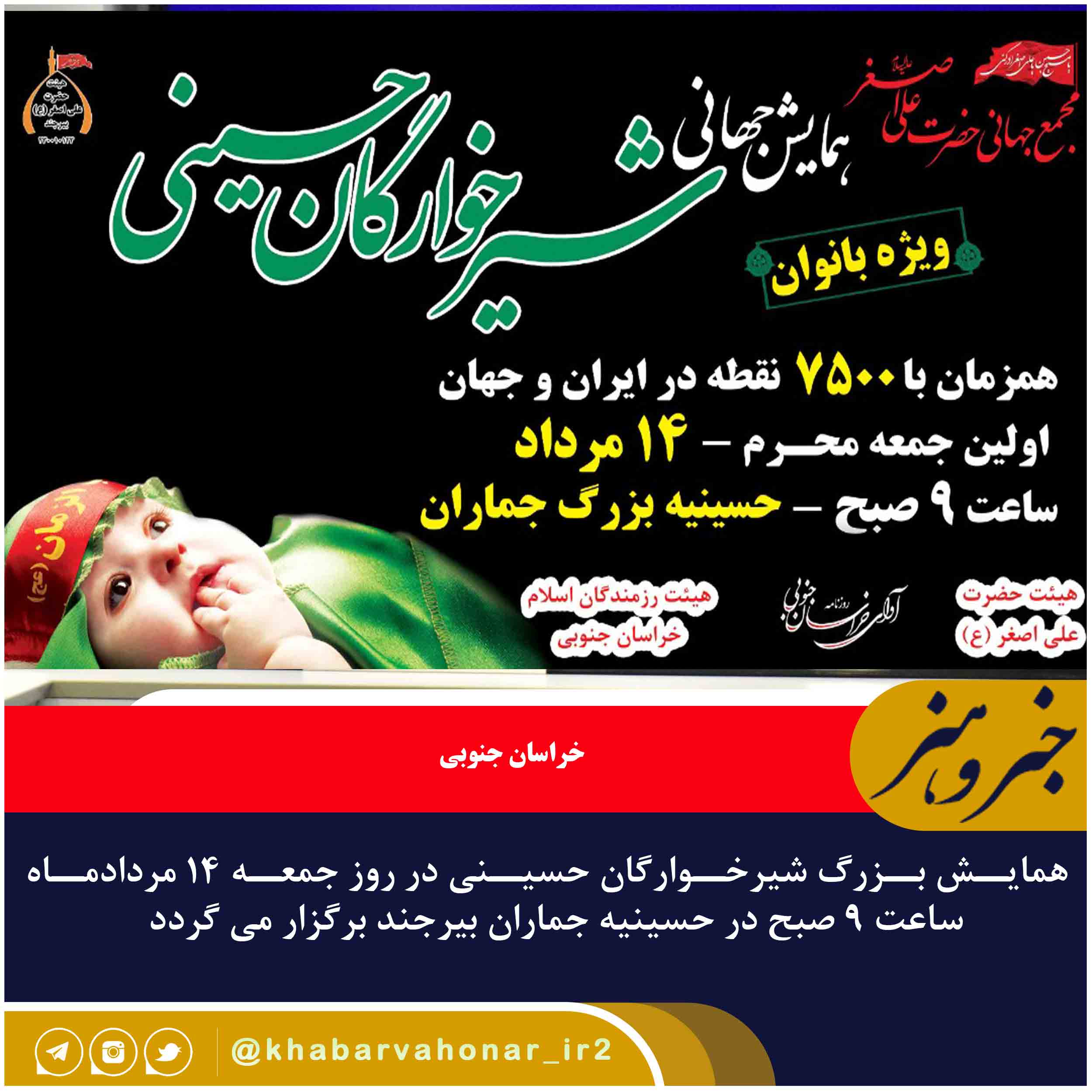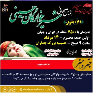 همایش بزرگ شیرخوارگان حسینی در روز جمعه ۱۴ مردادماه ساعت ۹ صبح در حسینیه جماران بیرجند برگزار می گردد