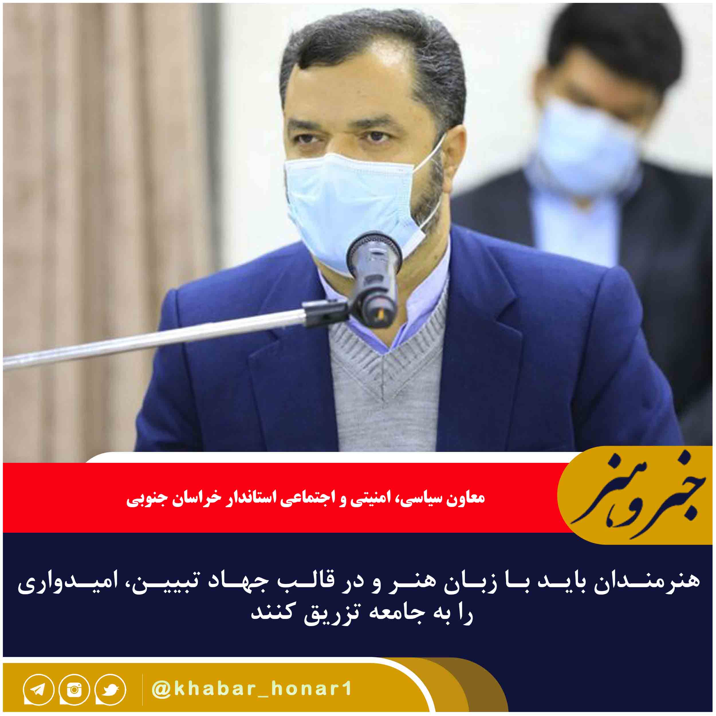 معاون سیاسی، امنیتی و اجتماعی استاندار خراسان جنوبی با تاکید بر اینکه خباثت دشمن در پایین آوردن توفیقات نظام و القای ناامیدی و یأس در مردم و به ویژه جوانان بر هیچ کس پوشیده نیست، گفت: هنرمندان باید با زبان هنر و در قالب جهاد تبیین، امیدواری را به جامعه تزریق کنند.