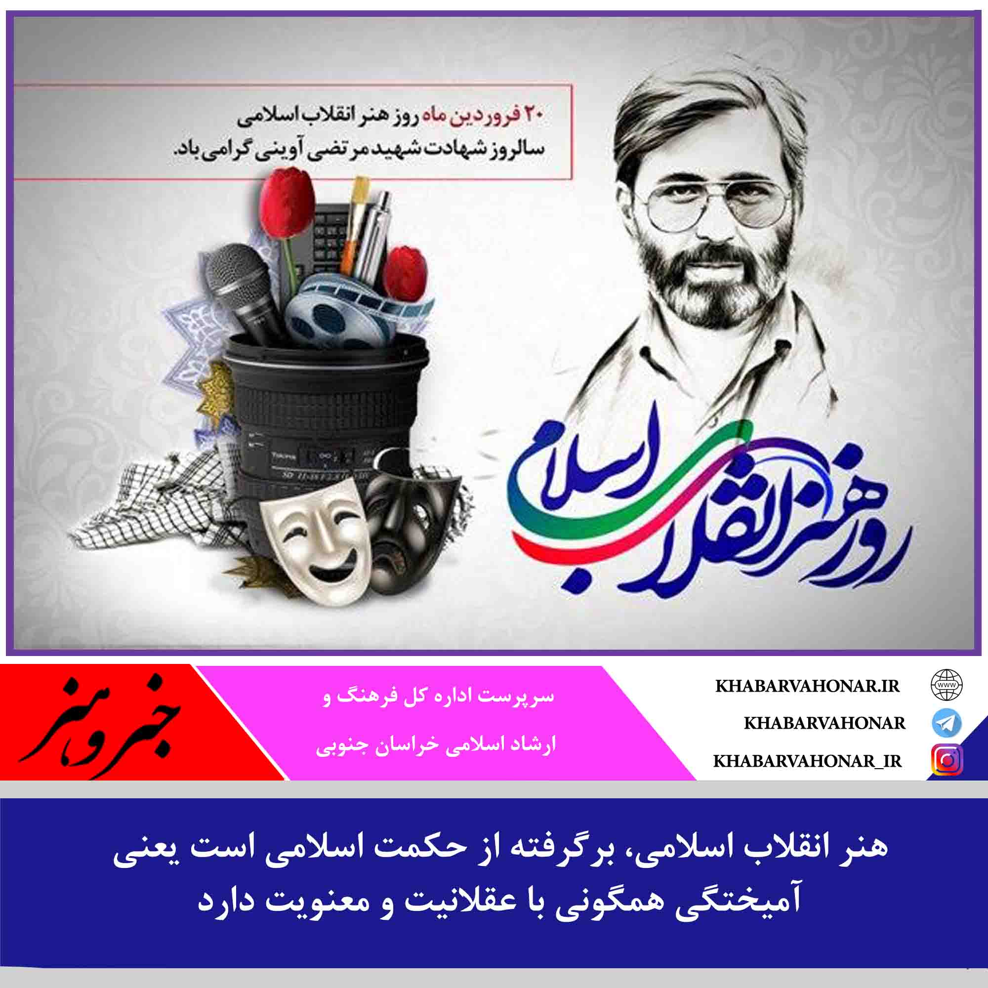 هنر انقلاب اسلامی، برگرفته از حکمت اسلامی است یعنی آمیختگی همگونی با عقلانیت و معنویت دارد. هنر انقلاب اسلامی باید معارف الهی را منتشر کند، باید دقیق و درست بوده و زیبایی ها را تبیین و حقیقت را تبلیغ کند، هنر انقلاب اسلامی باید از شکل تجملات خارج بوده و پیروزی های ملت غیور ایران اسلامی را روایت کند.