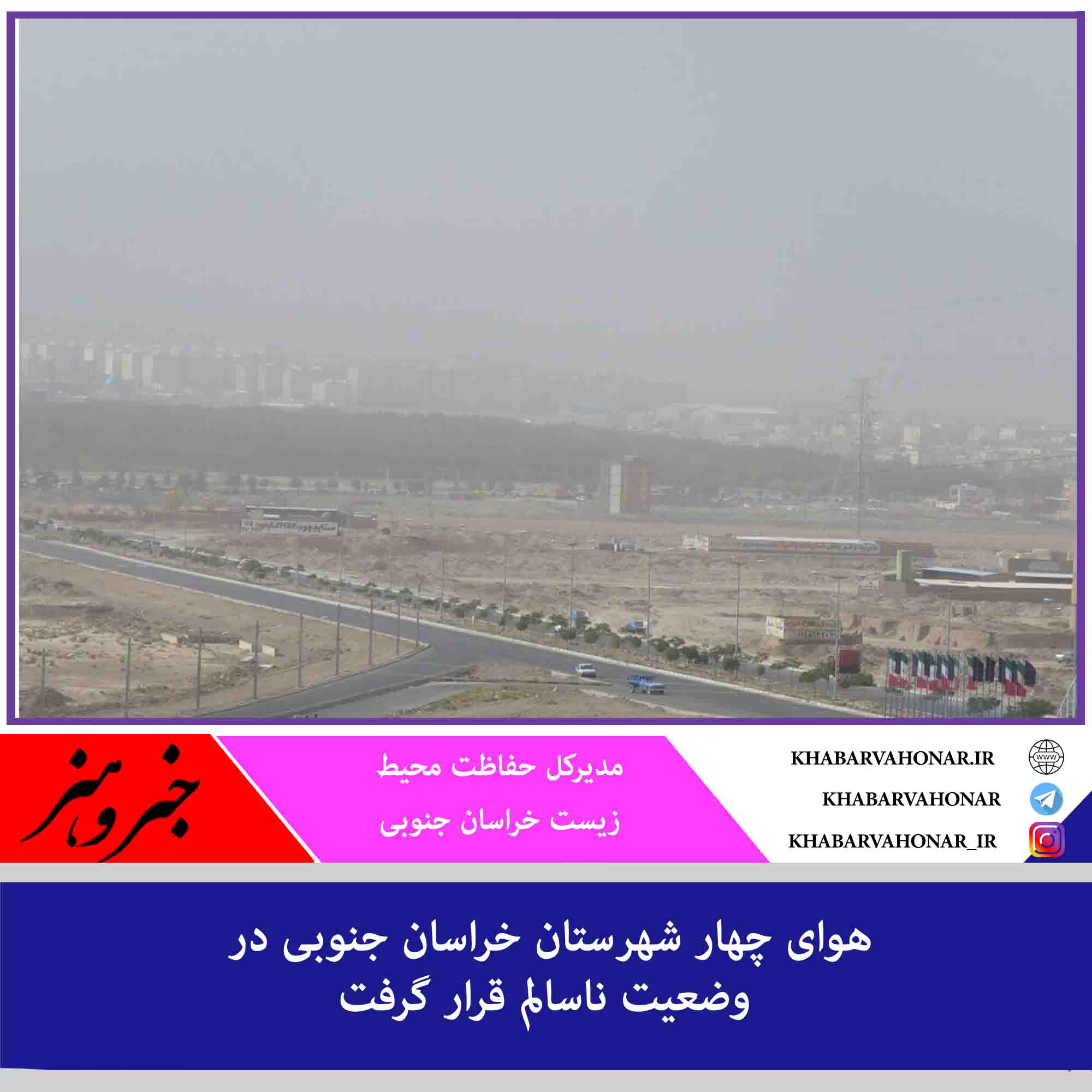 مدیرکل حفاظت محیط زیست خراسان جنوبی گفت: هوای چهار شهرستان استان برای همه گروهها در وضعیت ناسالم قرار گرفت و افراد مبتلا به بیماری آسم، سالمندان و کودکان از منزل خارج نشوند.