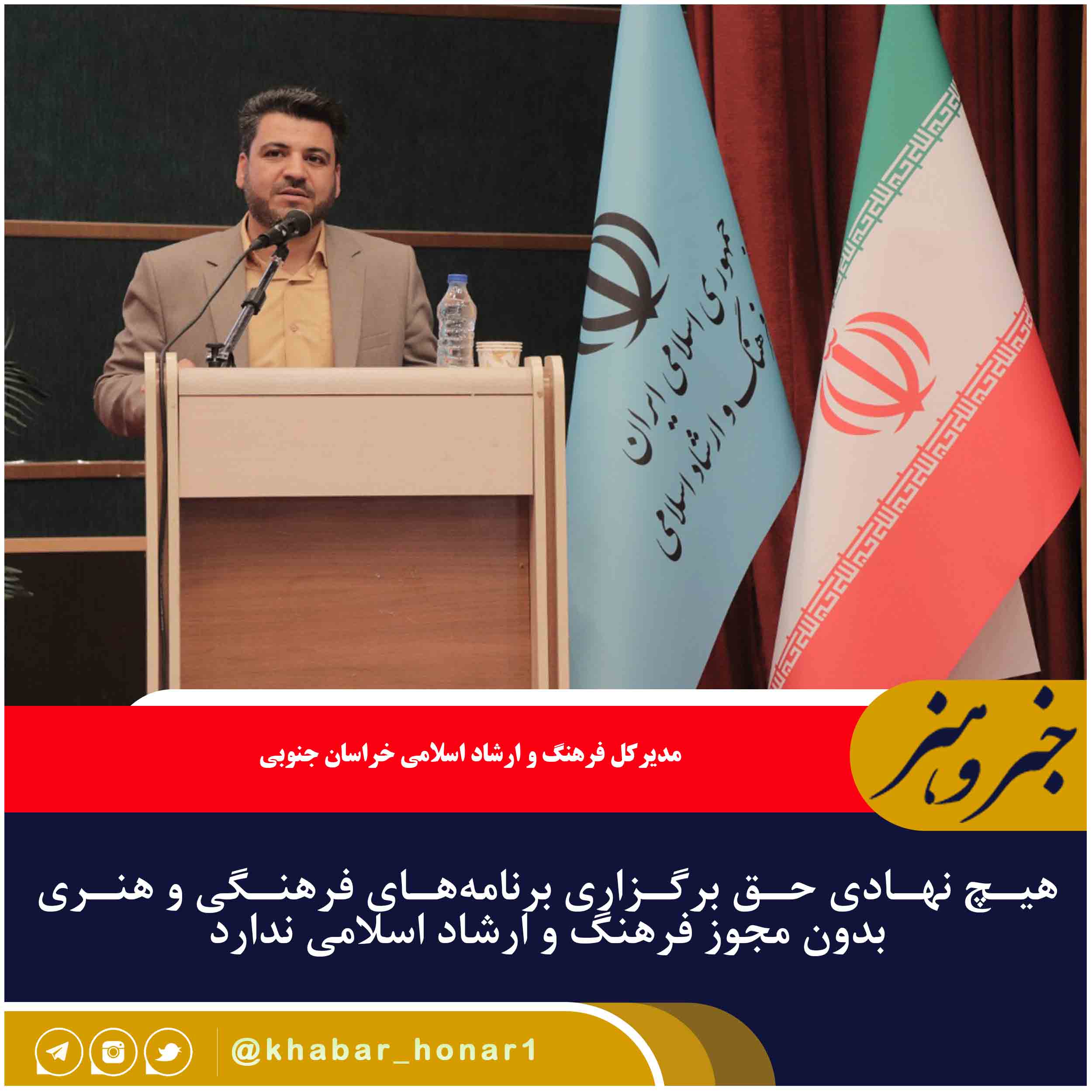 مدیرکل فرهنگ و ارشاد اسلامی خراسان جنوبی: مطابق قانون هیچ نهادی حق برگزاری برنامههای فرهنگی و هنری بدون مجوز فرهنگ و ارشاد اسلامی ندارد و در صورت بروز تخلف موظف به پاسخگویی است.