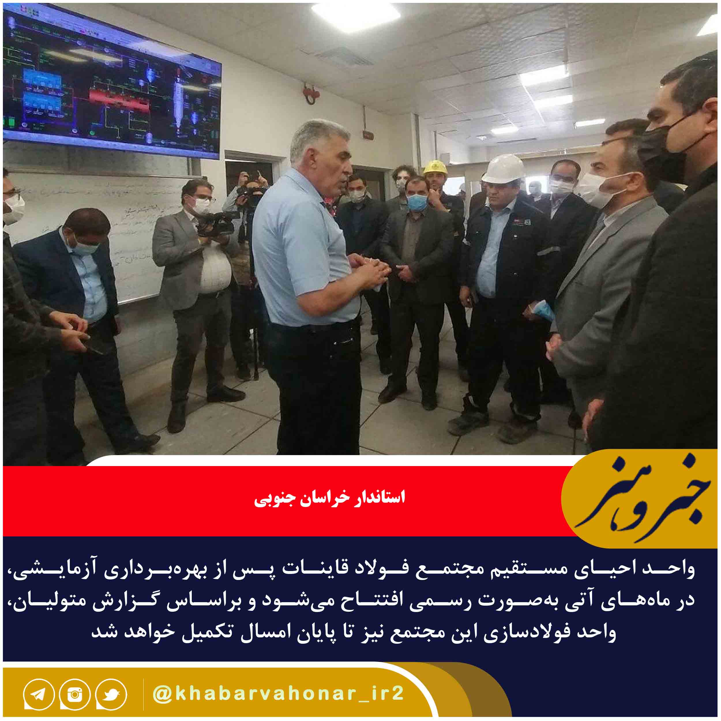 استاندار خراسان جنوبی گفت: واحد احیای مستقیم مجتمع فولاد قاینات پس از بهرهبرداری آزمایشی، در ماههای آتی بهصورت رسمی افتتاح میشود و براساس گزارش متولیان، واحد فولادسازی این مجتمع نیز تا پایان امسال تکمیل خواهد شد.