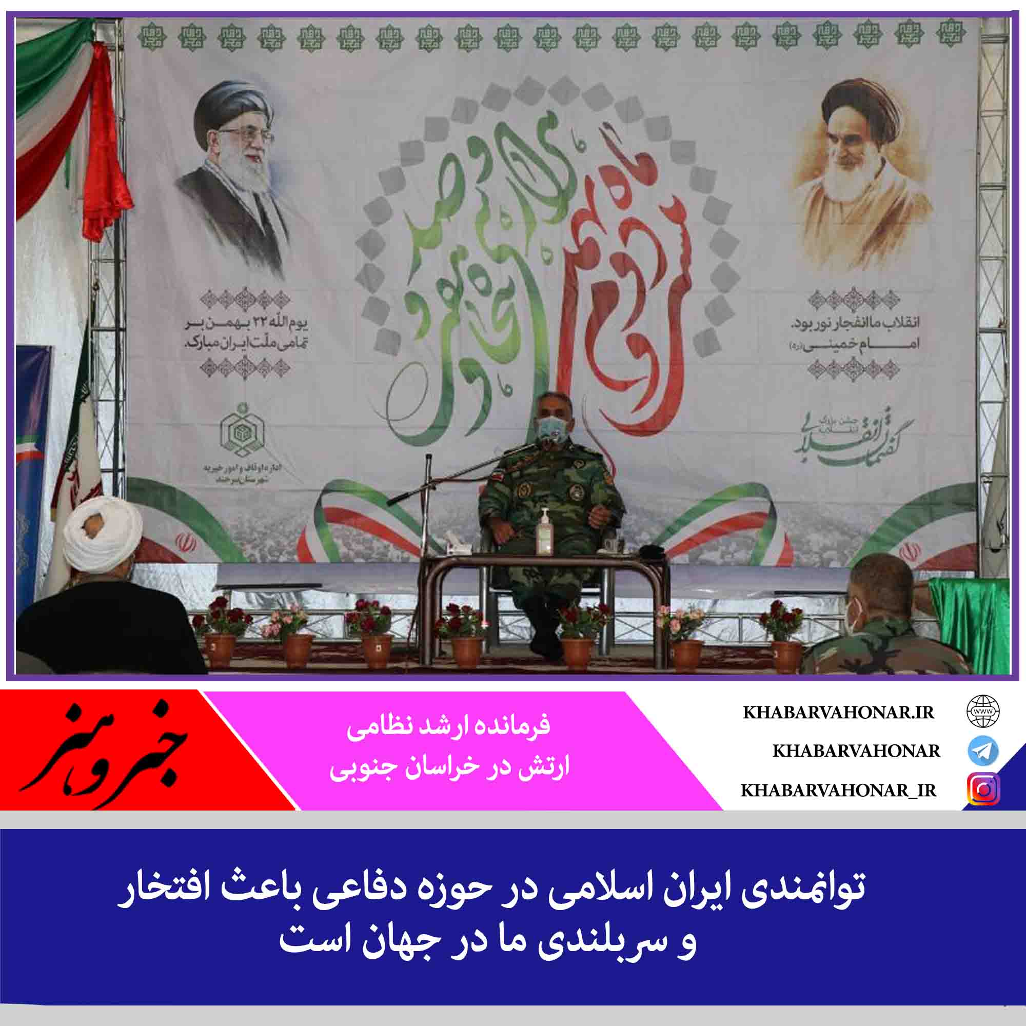 فرمانده ارشد نظامی ارتش در خراسان جنوبی گفت: توانمندی ایران اسلامی در حوزه دفاعی باعث افتخار و سربلندی ما در جهان است و توان دفاعی دریایی ما با پیشرفتهای چشمگیر لرزه بر تن دشمن میاندازد.