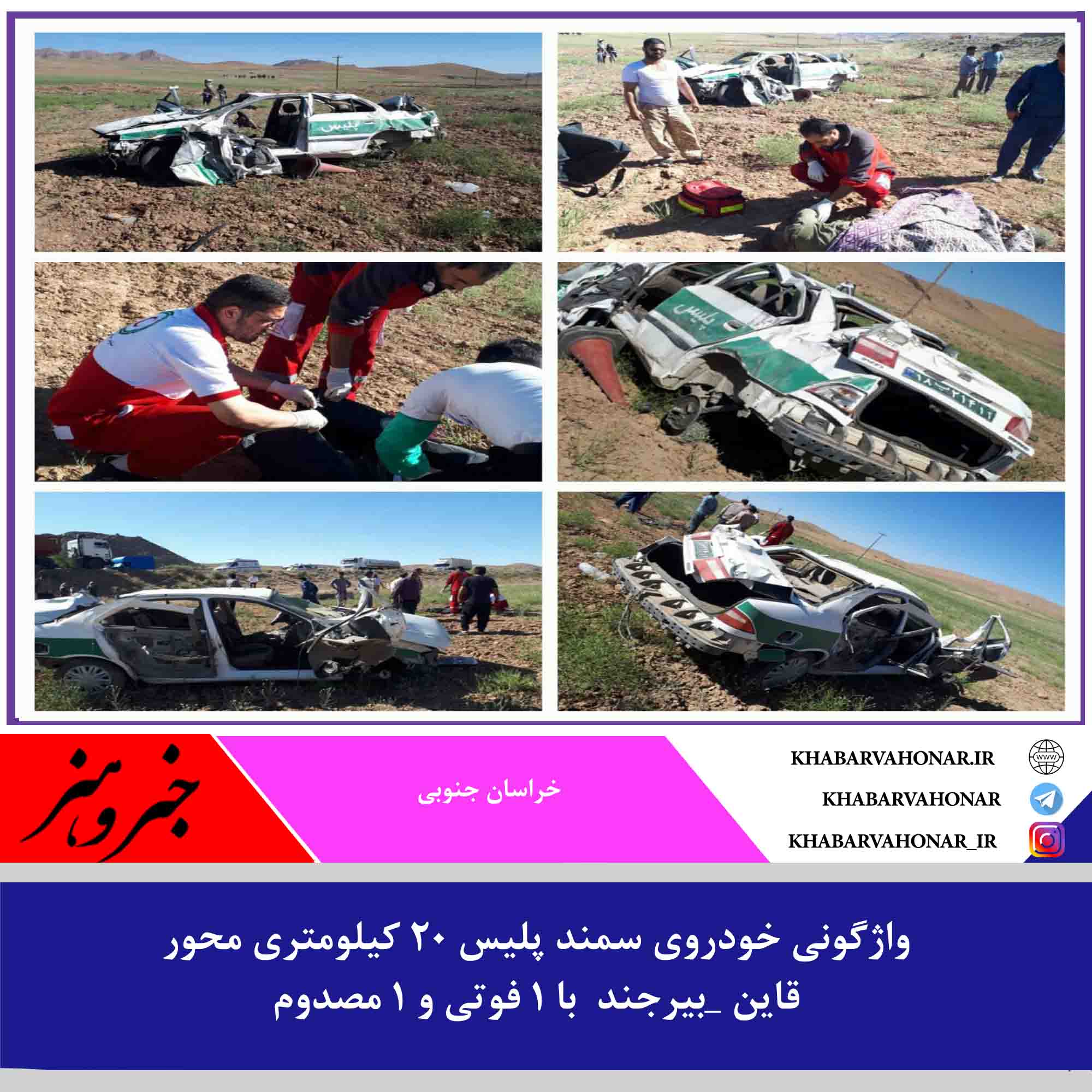 واژگونی خودروی سمند پلیس ۲۰ کیلومتری محور قاین _بیرجند با ۱ فوتی و ۱ مصدوم