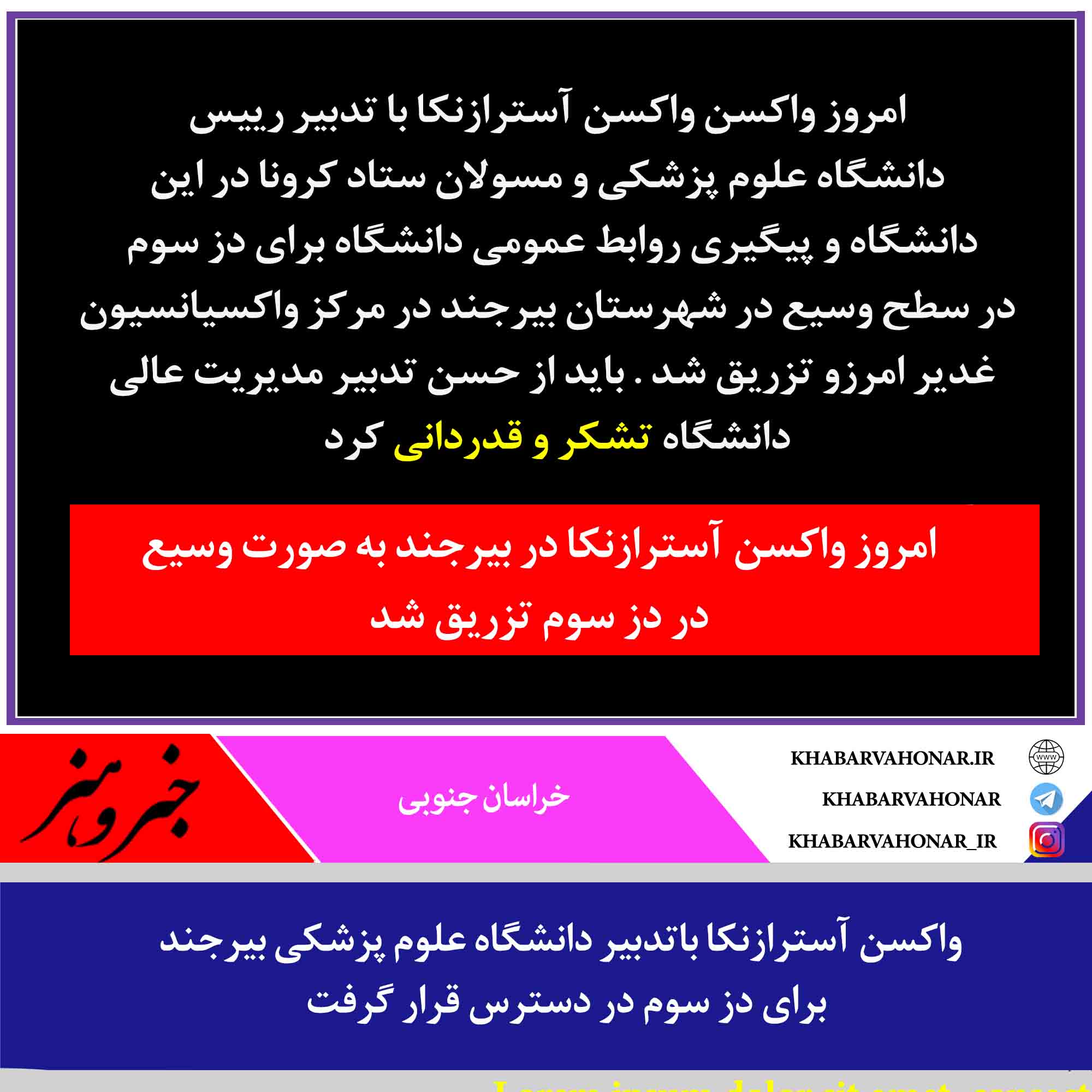 امروز واکسن آسترازنکا در بیرجند به صورت وسیع در دز سوم تزریق شد