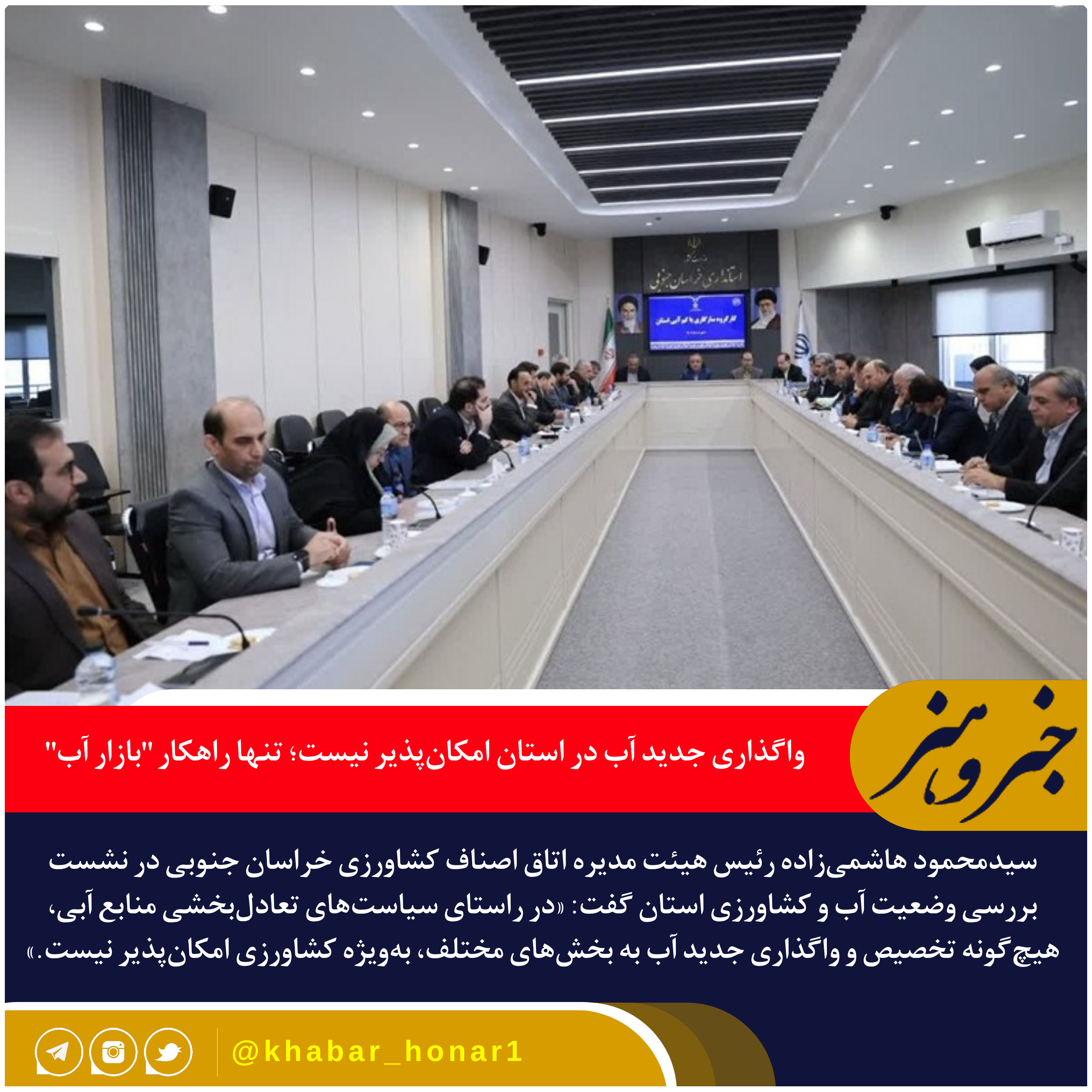 به گزارش خبر و هنر، سیدمحمود هاشمیزاده رئیس هیئت مدیره اتاق اصناف کشاورزی خراسان جنوبی در نشست بررسی وضعیت آب و کشاورزی استان گفت: «در راستای سیاستهای تعادلبخشی منابع آبی، هیچگونه تخصیص و واگذاری جدید آب به بخشهای مختلف، بهویژه کشاورزی امکانپذیر نیست.»