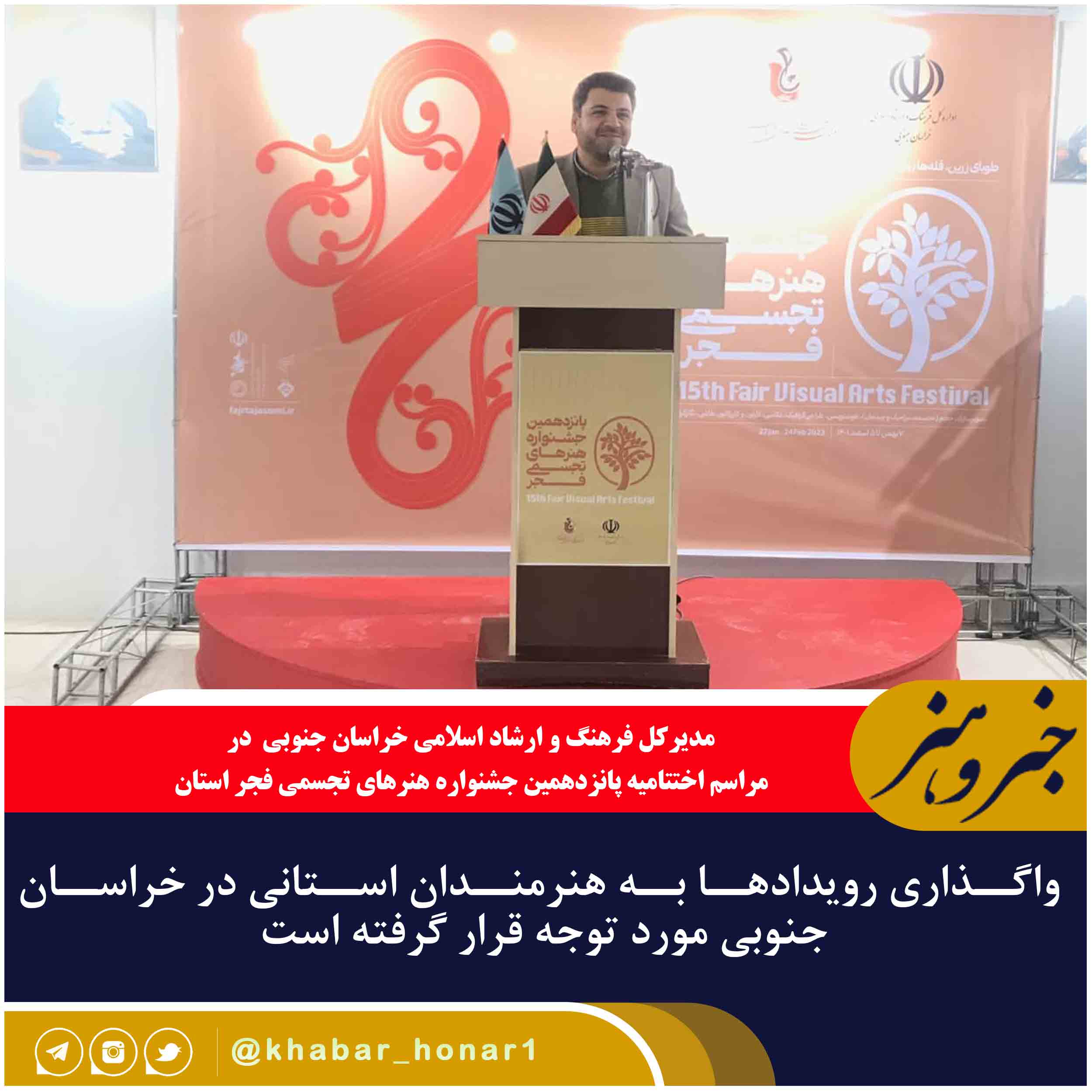 مراسم اختتامیه پانزدهمین جشنواره هنرهای تجسمی فجر استان خراسان جنوبی با حضور مدیرکل فرهنگ و ارشاد اسلامی استان و جمعی از مسئولین و فرهیختگان برگزار گردید. علی فرخنده ضمن تبریک چهل و چهارمین سالگرد پیروزی انقلاب اسلامی گفت: در این دوره از جشنواره تجسم هنر که در هشت رشته: تصویرسازی، حجم، خوشنویسی، طراحی گرافیک، عکاسی، کارتون و کاریکاتور، نقاشی و نگارگری برگزار شد، میزبان قریب به ۱۲۸ اثر از هنرمندان عزیز استان بودیم که از این تعداد ۲۸ مورد به دبیرخانه جشنواره در سطح ملی راه پیدا نموده است.