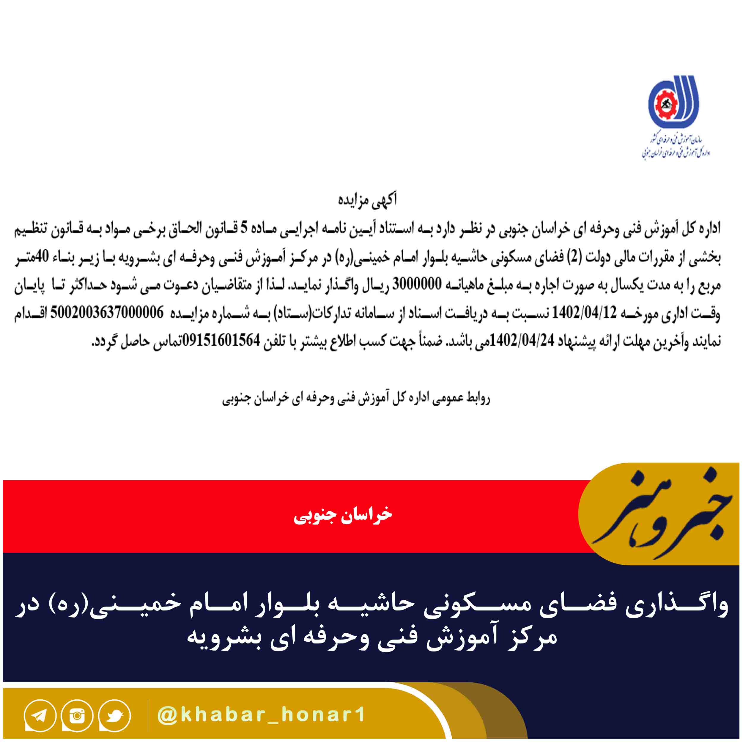 اداره کل آموزش فنی وحرفه ای خراسان جنوبی در نظر دارد به استناد آیین نامه اجرایی ماده ۵ قانون الحاق برخی مواد به قانون تنظیم بخشی از مقررات مالی دولت (۲) فضای مسکونی حاشیه بلوار امام خمینی(ره) در مرکز آموزش فنی وحرفه ای بشرویه با زیر بناء ۴۰متر مربع را به مدت یکسال به صورت اجاره به مبلغ ماهیانه ۳۰۰۰۰۰۰ ریال واگذار نماید. لذا از متقاضیان دعوت می شود حداکثر تا پایان وقت اداری مورخه ۱۲/۰۴/۱۴۰۲ نسبت به دریافت اسناد از سامانه تدارکات(ستاد) به شماره مزایده ۵۰۰۲۰۰۳۶۳۷۰۰۰۰۰۶ اقدام نمایند وآخرین مهلت ارائه پیشنهاد ۲۴/۰۴/۱۴۰۲می باشد. ضمناً جهت کسب اطلاع بیشتر با تلفن ۰۹۱۵۱۶۰۱۵۶۴تماس حاصل گردد.