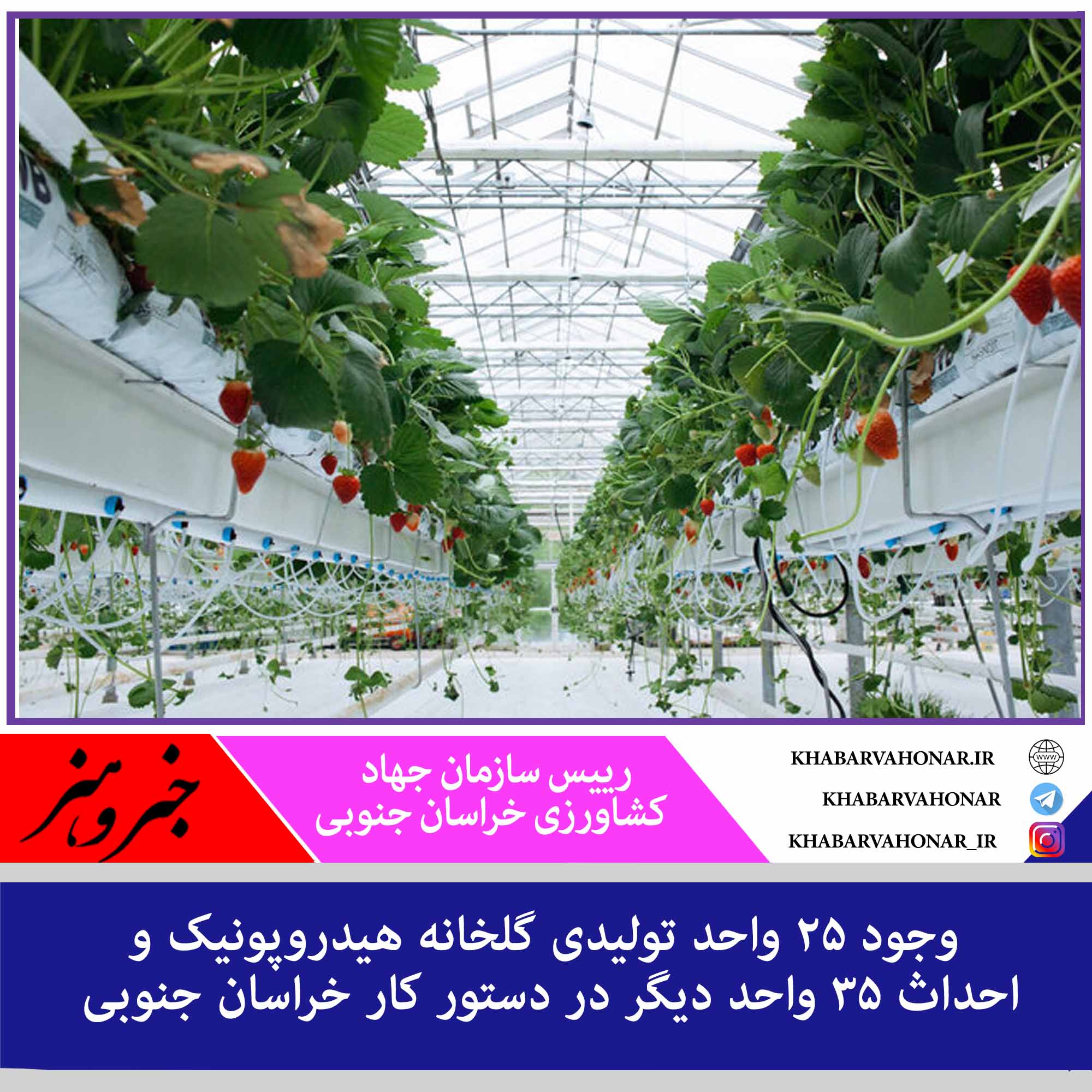 رییس سازمان جهاد کشاورزی خراسان جنوبی از وجود ۲۵ واحد تولیدی هیدروپونیک در استان خبر داد و افزود: ۳۵ واحد دیگر نیز در حال احداث هستند.