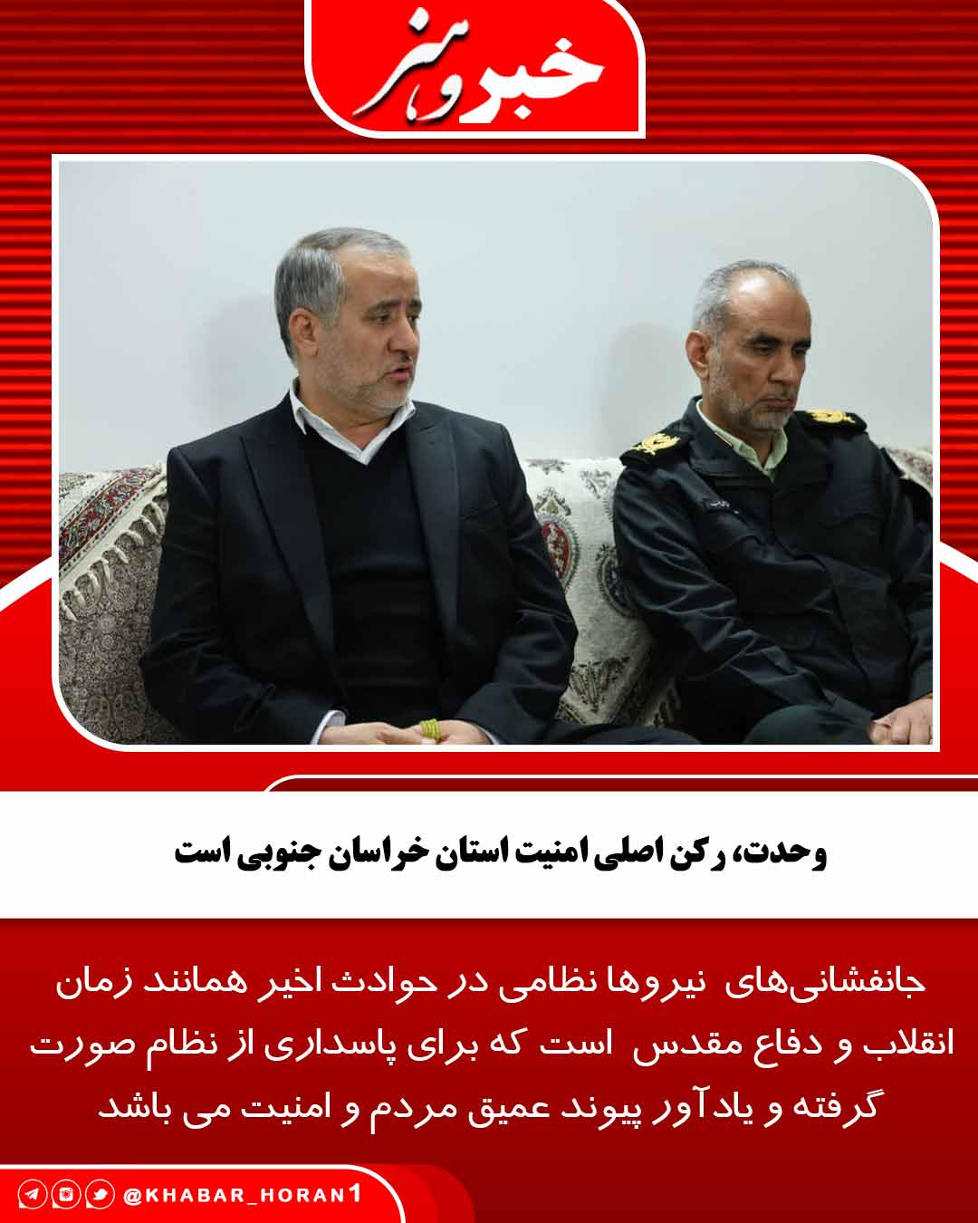 🔹استاندار خراسان جنوبی گفت: وحدت، رکن اصلی امنیت استان خراسان جنوبی است.