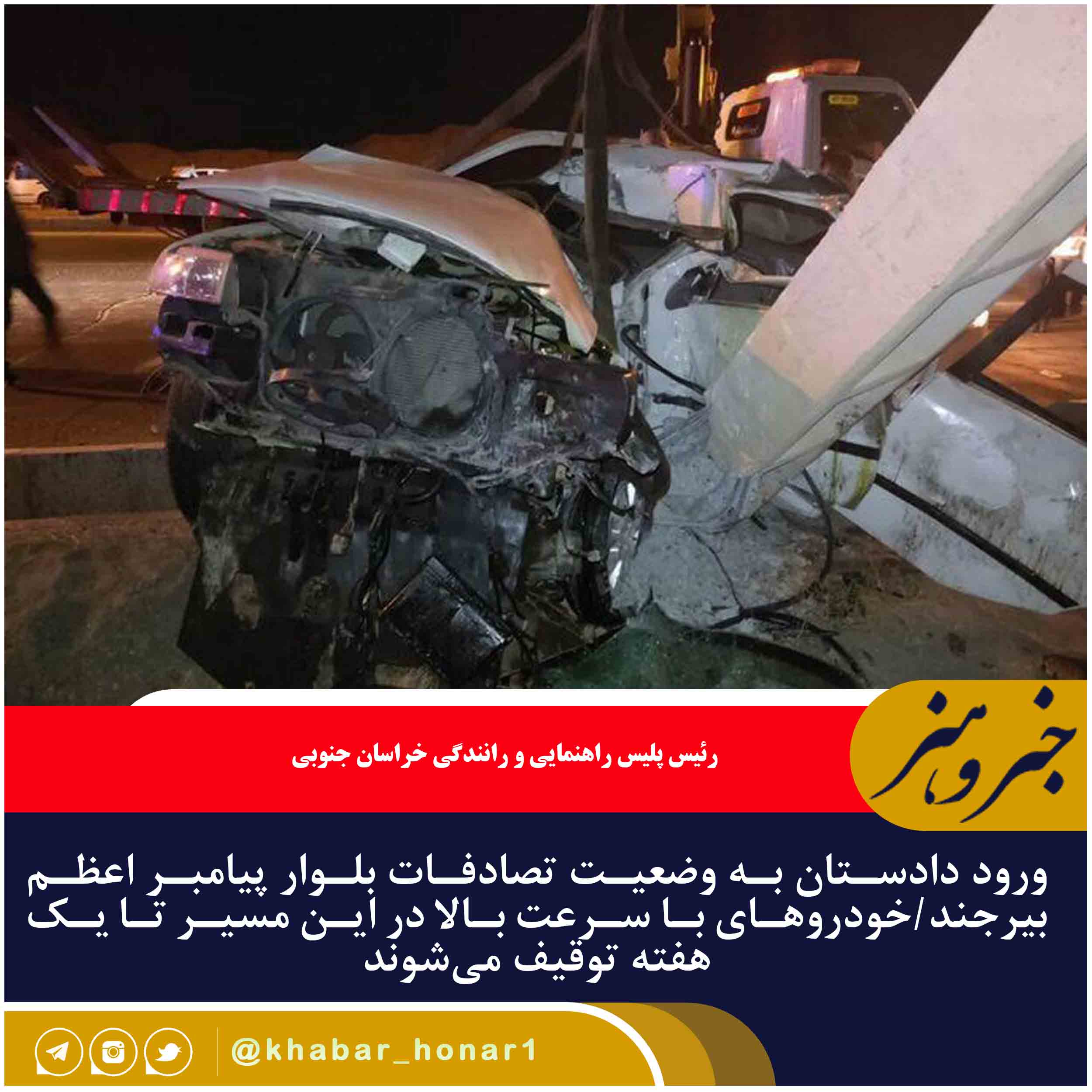 بتازگی در پی وقوع ۲ فقره تصادف شدید در بلوار پیامبر اعظم (ص) بیرجند که منجر به مصدومیت هفت نفر شد، رئیس پلیس راهور خراسان جنوبی اعلام کرد که پلیس راهنمایی و رانندگی برابر وظیفه ذاتی در هر ۲ تصادف علاوه بر رانندگان، دستگاههای مرتبط با استانداردسازی، آرامسازی و هوشمندسازی این بلوار را نیز به عنوان مقصر معرفی کرده است.