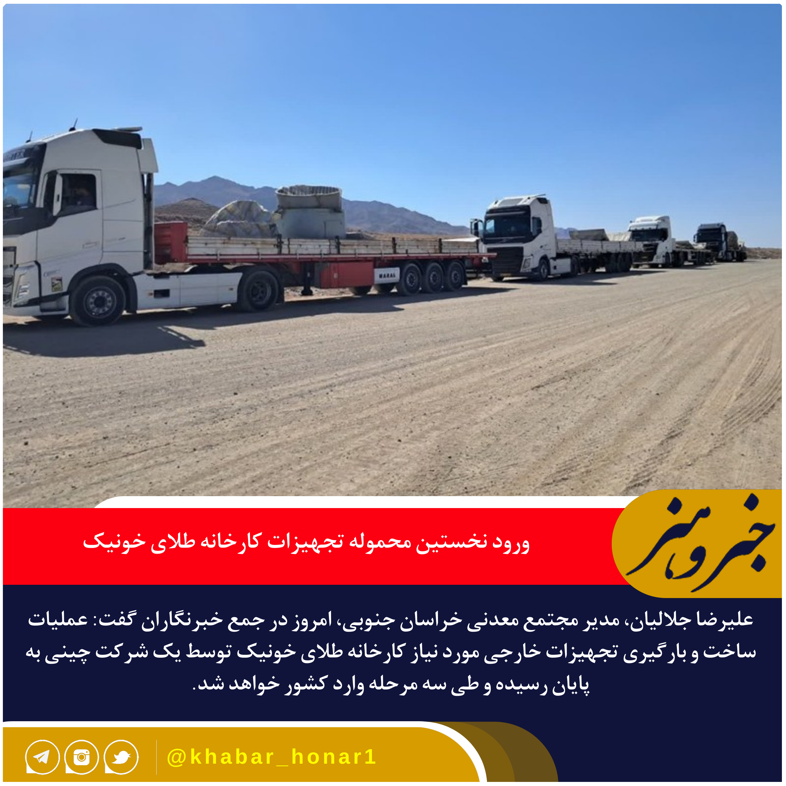 به گزارش خبر و هنر، علیرضا جلالیان، مدیر مجتمع معدنی خراسان جنوبی، امروز در جمع خبرنگاران گفت: عملیات ساخت و بارگیری تجهیزات خارجی مورد نیاز کارخانه طلای خونیک توسط یک شرکت چینی به پایان رسیده و طی سه مرحله وارد کشور خواهد شد.