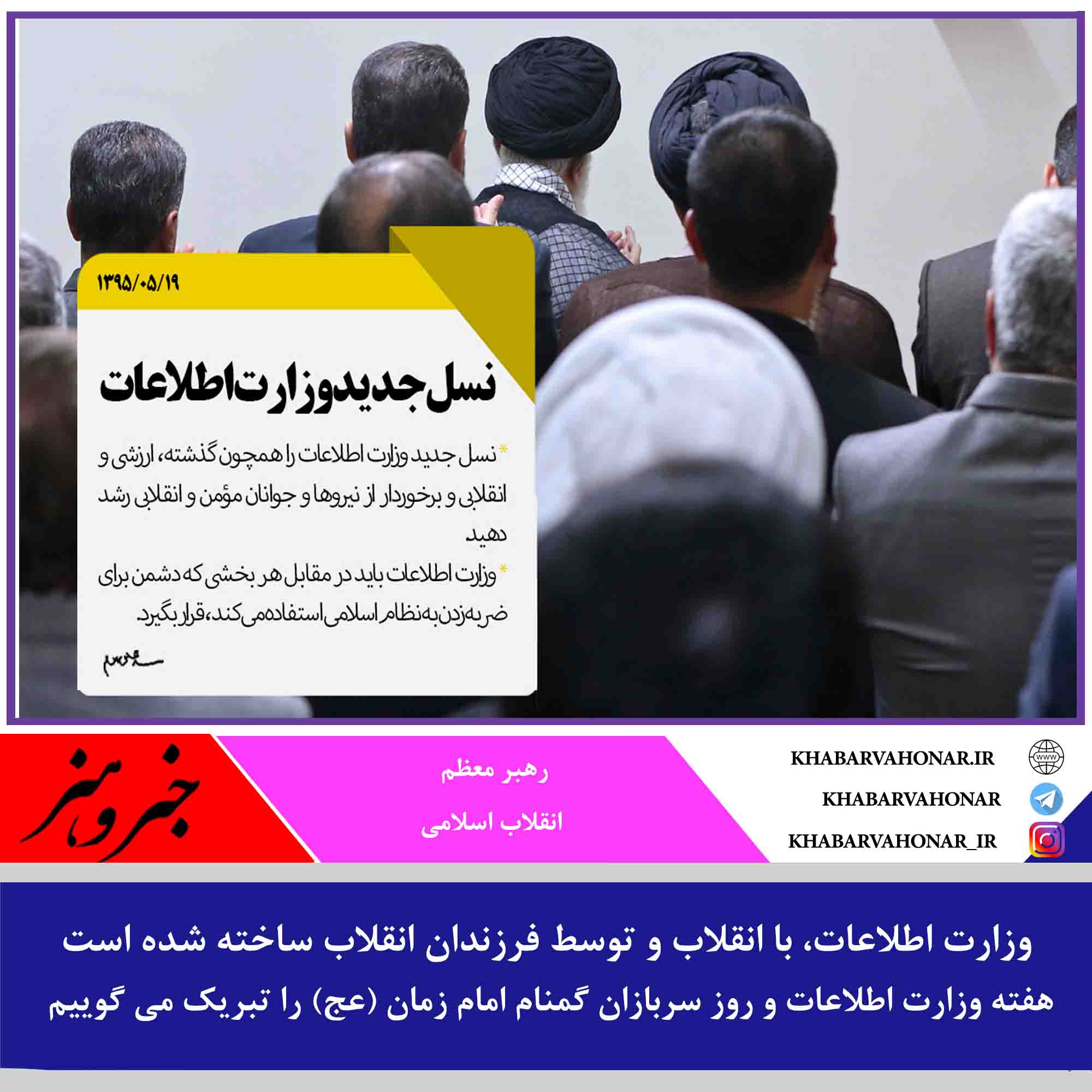 وزارت اطلاعات، با انقلاب و توسط فرزندان انقلاب ساخته شده است؛ پس باید تمام کارکنان وزارت اطلاعات با تمام قدرت انقلابی مانده و انقلابی حرکت کنند؛ و هیچ لحظه ای از این هدف غافل نشوند. وزارت اطلاعات همواره باید مطیع و تابع نظام باشد. در تمامی جهان دستگاههای اطلاعاتی مطیع سیاست حاکم بر آن کشور هستند. برای وزارت اطلاعات نیز همینگونه است.