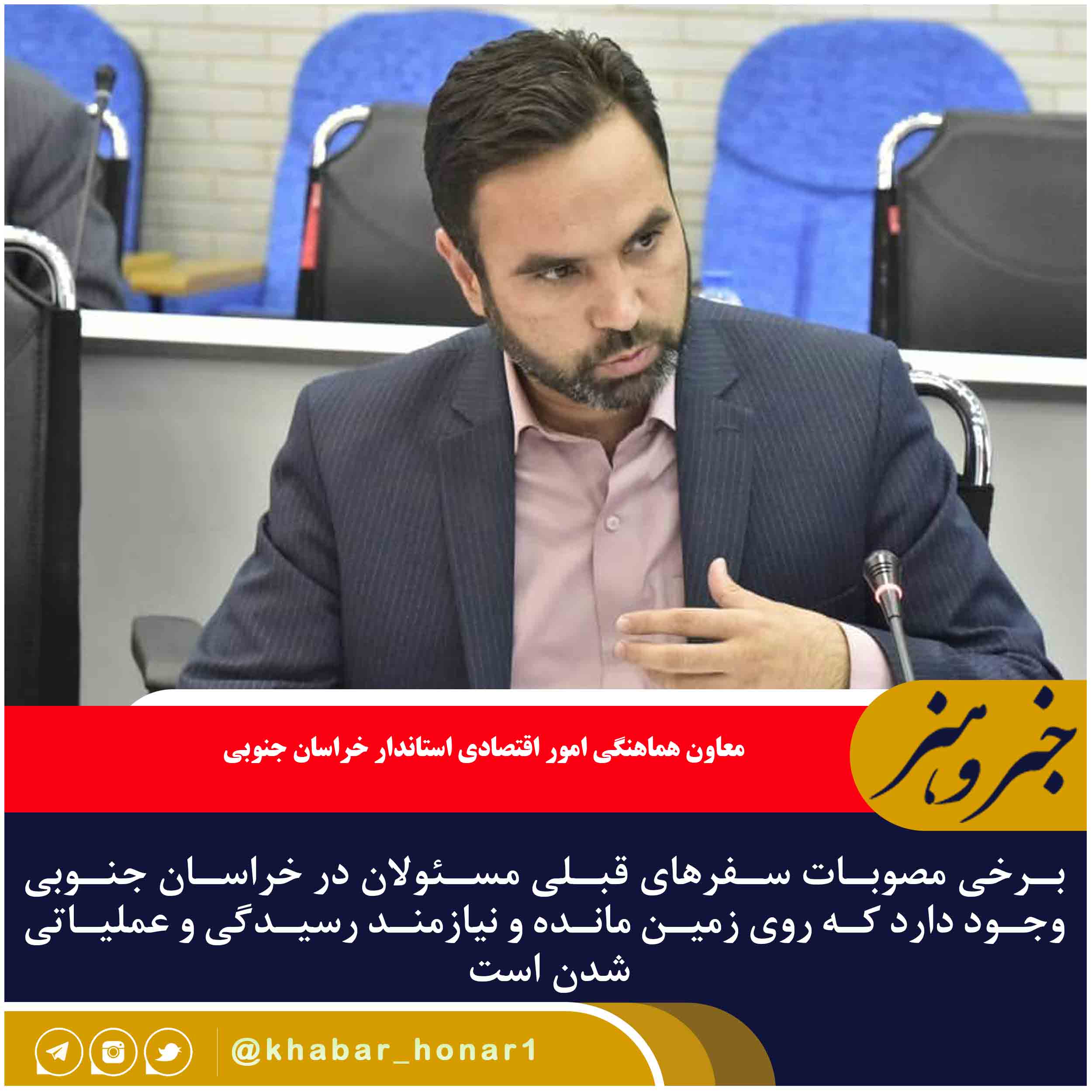 ?معاون هماهنگی امور اقتصادی استاندار خراسان جنوبی گفت : برخی مصوبات سفرهای قبلی مسئولان در خراسان جنوبی وجود دارد که روی زمین مانده و نیازمند رسیدگی و عملیاتی شدن است.