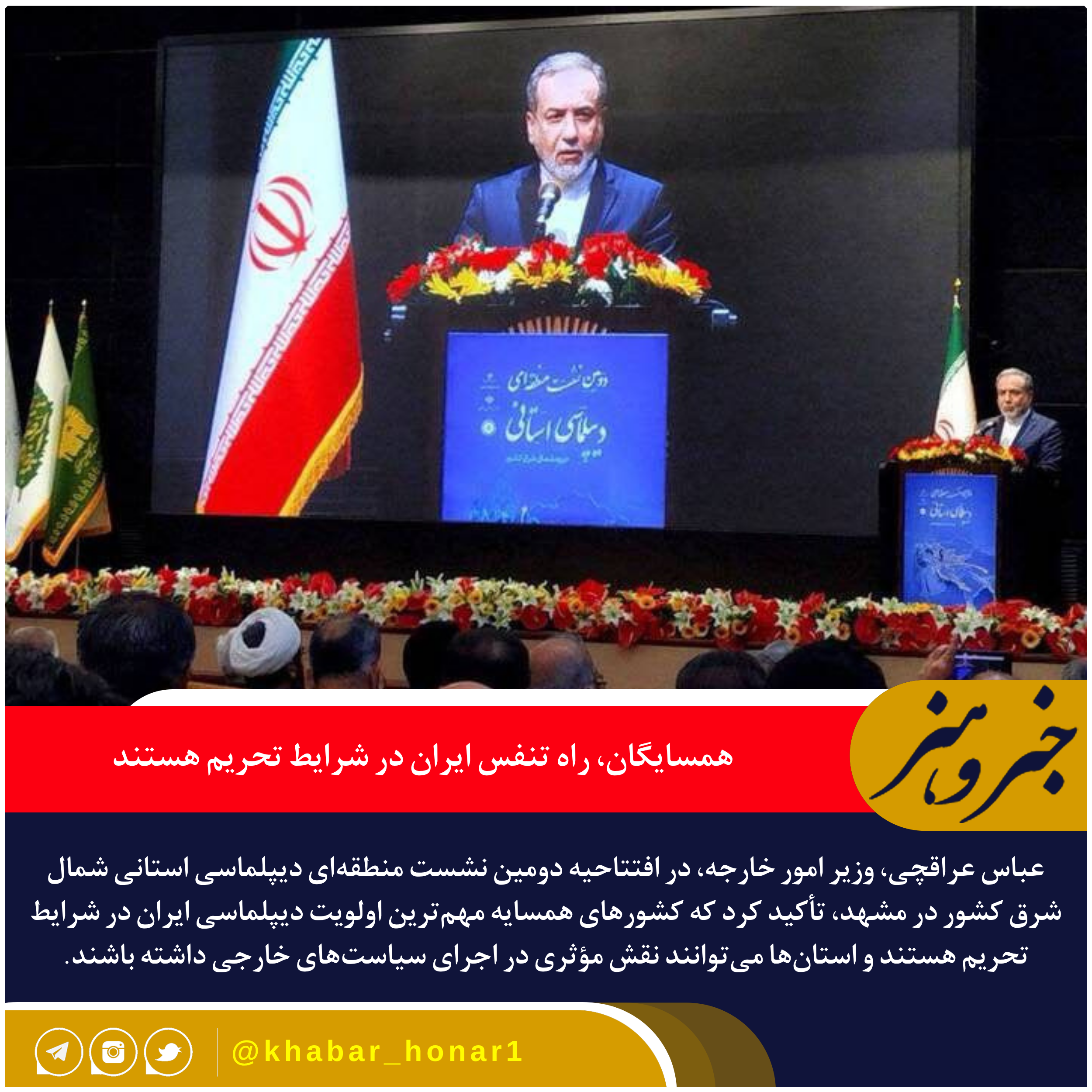 به گزارش خبر و هنر، عصر چهارشنبه، عباس عراقچی، وزیر امور خارجه در افتتاحیه دومین نشست منطقهای دیپلماسی استانی حوزه شمال شرق کشور، با بیان اهمیت همکاری با کشورهای همسایه، گفت: «تجارت ایران با هر یک از همسایگان بیش از کل تجارت با اروپا است و این نشاندهنده اهمیت دیپلماسی منطقهای است.»