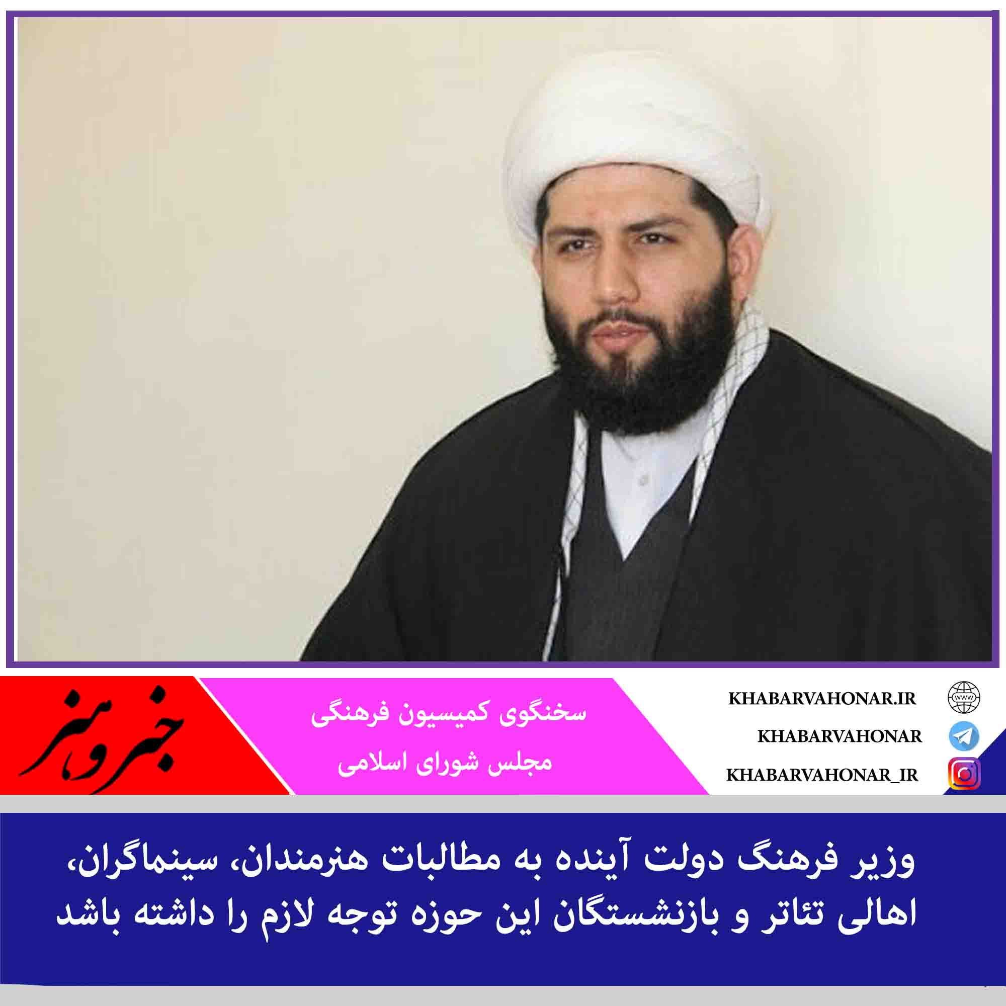 سخنگوی کمیسیون فرهنگی مجلس شورای اسلامی گفت: وزیر فرهنگ و ارشاد اسلامی دولت ابراهیم رییسی به مسائلی چون جمعیت، ساماندهی فضای مجازی و مطالبات جامعه هنری کشور توجه لازم را داشته باشد.
