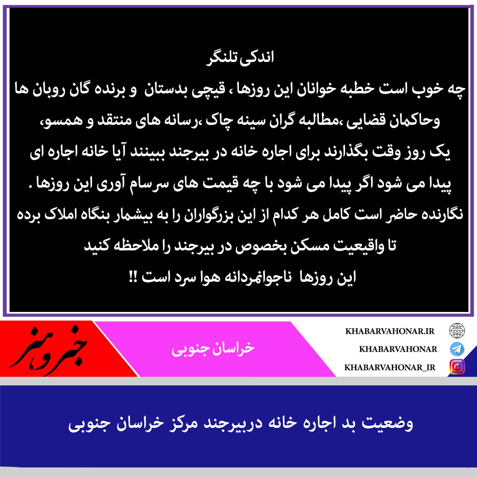 اندکی تلنگر چه خوب است خطبه خوانان این روزها ، قیچی بدستان و برنده گان روبان ها وحاکمان قضایی ،مطالبه گران سینه چاک ،رسانه های منتقد و همسو، یک روز وقت بگذارند برای اجاره خانه در بیرجند ببینند آیا خانه اجاره ای پیدا می شود اگر پیدا می شود با چه قیمت های سرسام آوری این روزها . نگارنده حاضر است کامل هر کدام از این بزرگواران را به بیشمار بنگاه املاک برده تا واقیعیت مسکن بخصوص در بیرجند را ملاحظه کنید این روزها ناجوانمردانه هوا سرد است !!