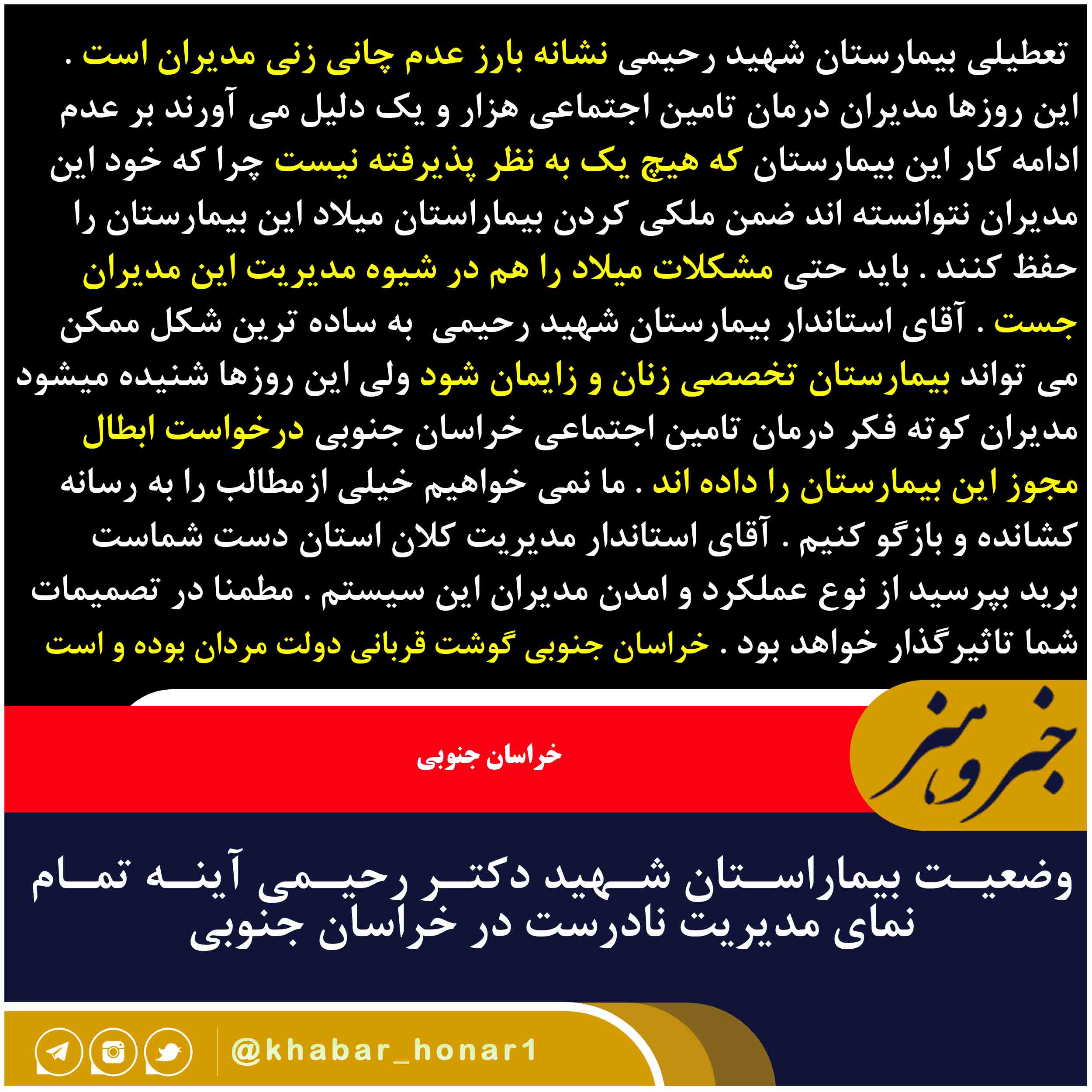 تعطیلی بیمارستان شهید رحیمی نشانه بارز عدم چانی زنی مدیران است . این روزها مدیران درمان تامین اجتماعی هزار و یک دلیل می آورند بر عدم ادامه کار این بیمارستان که هیچ یک به نظر پذیرفته نیست چرا که خود این مدیران نتوانسته اند ضمن ملکی کردن بیماراستان میلاد این بیمارستان را حفظ کنند . باید حتی مشکلات میلاد را هم در شیوه مدیریت این مدیران جست . آقای استاندار بیمارستان شهید رحیمی به ساده ترین شکل ممکن می تواند بیمارستان تخصصی زنان و زایمان شود ولی این روزها شنیده میشود مدیران کوته فکر درمان تامین اجتماعی خراسان جنوبی درخواست ابطال مجوز این بیمارستان را داده اند . ما نمی خواهیم خیلی ازمطالب را به رسانه کشانده و بازگو کنیم . آقای استاندار مدیریت کلان استان دست شماست برید بپرسید از نوع عملکرد و امدن مدیران این سیستم . مطمنا در تصمیمات شما تاثیرگذار خواهد بود . خراسان جنوبی گوشت قربانی دولت مردان بوده و است