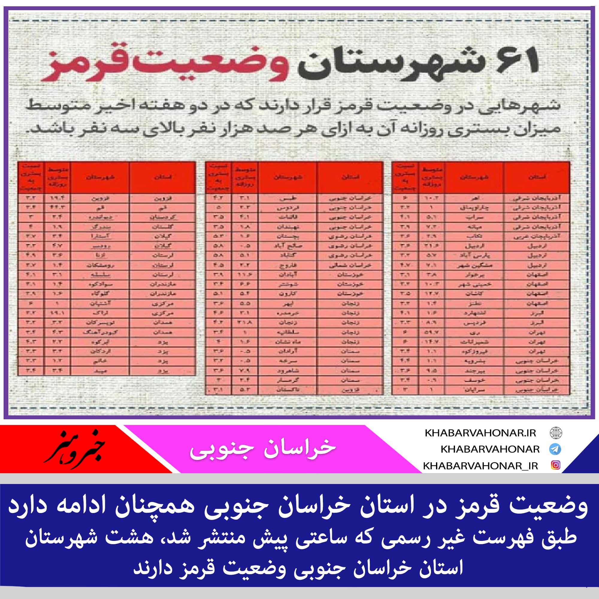 ?طبق فهرست غیر رسمی که ساعتی پیش منتشر شد، هشت شهرستان استان خراسان جنوبی وضعیت قرمز دارند.