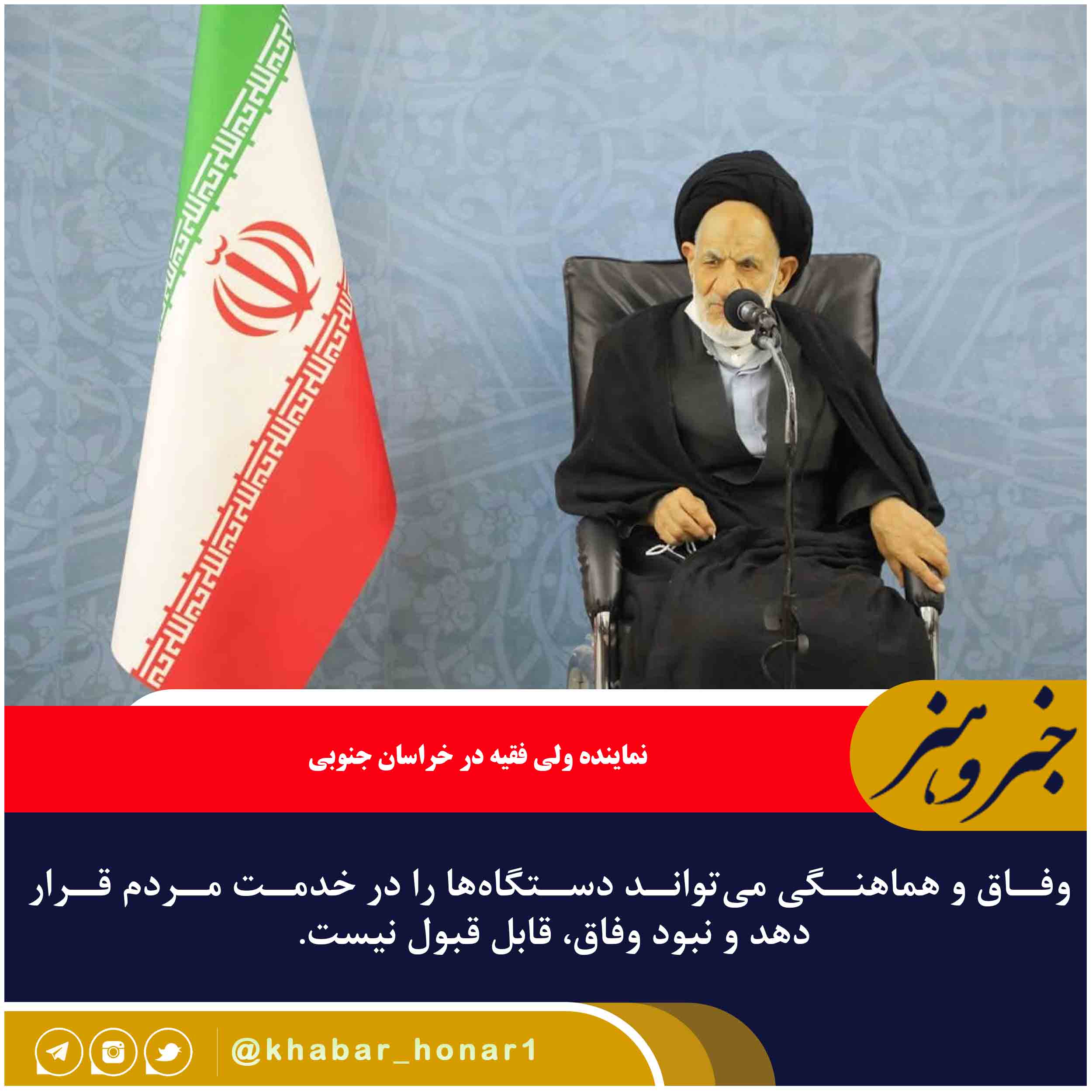 نماینده ولی فقیه در خراسان جنوبی و امام جمعه بیرجند گفت: وفاق و هماهنگی می‌تواند دستگاه‌ها را در خدمت مردم قرار دهد و نبود وفاق، قابل قبول نیست.