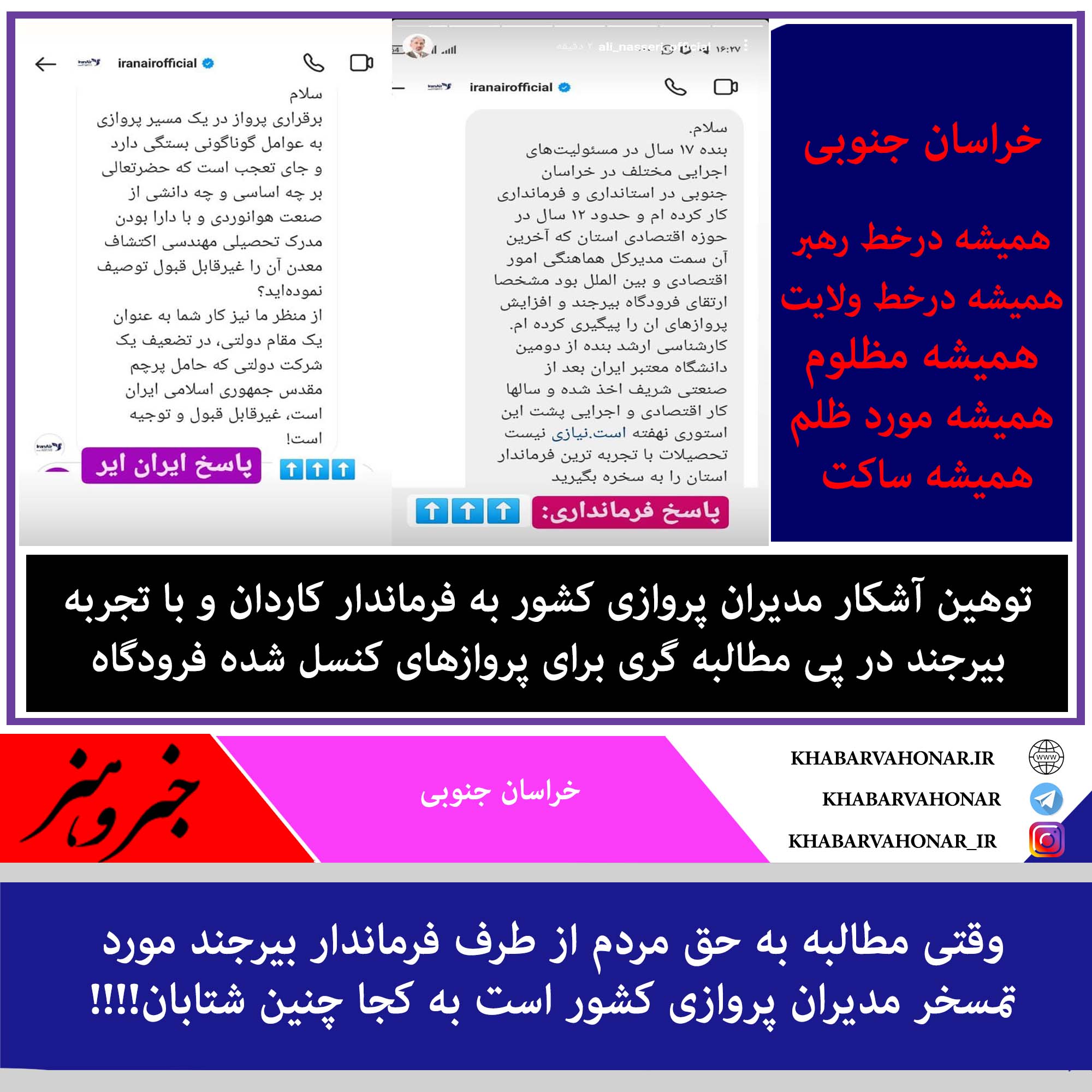 خراسان جنوبی همیشه درخط رهبر همیشه درخط ولایت همیشه مظلوم همیشه مورد ظلم همیشه ساکت توهین آشکار مدیران پروازی کشور به فرماندار کاردان و با تجربه بیرجند در پی مطالبه گری برای پروازهای کنسل شده فرودگاه