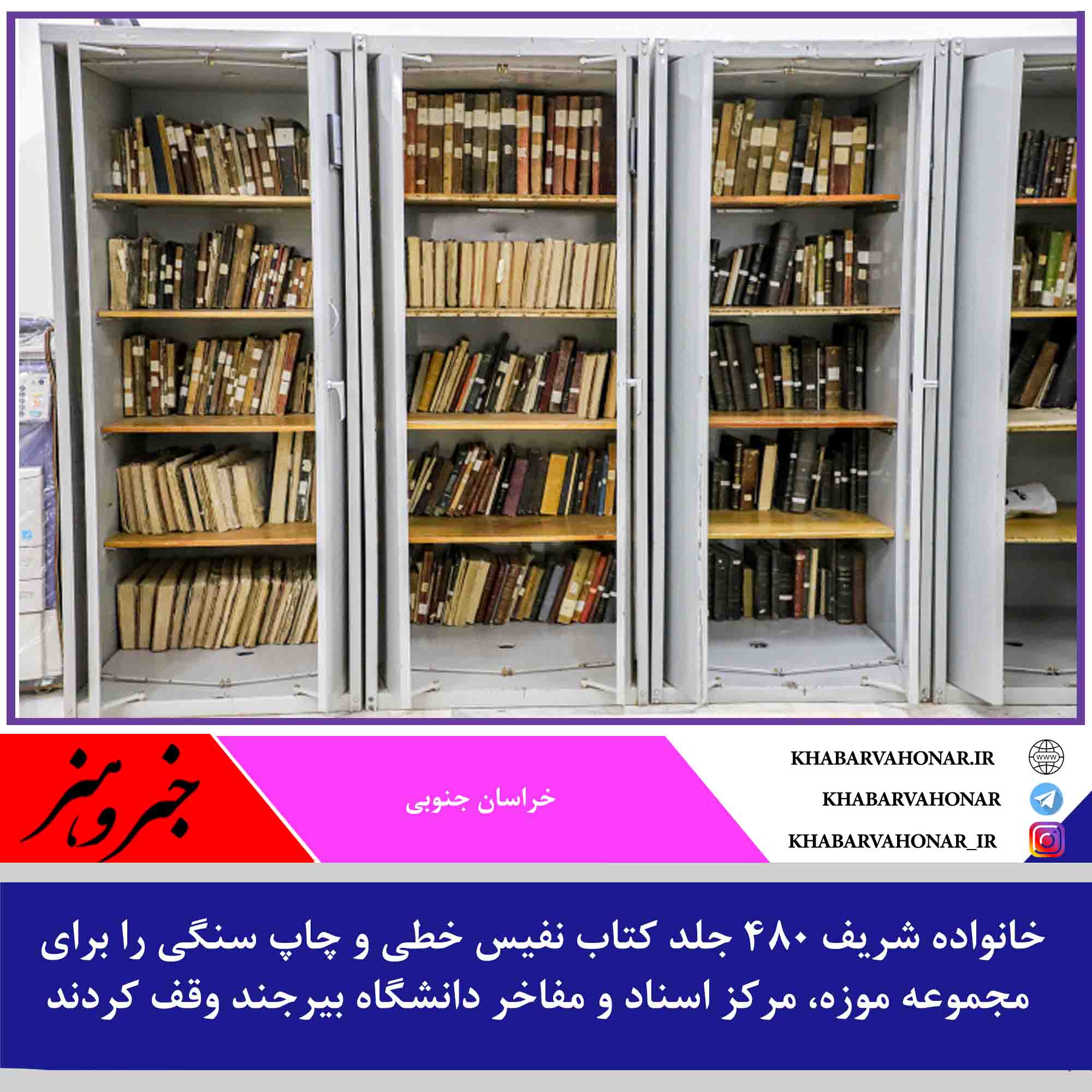 خانواده شریف ۴۸۰ جلد کتاب نفیس خطی و چاپ سنگی را برای مجموعه موزه، مرکز اسناد و مفاخر دانشگاه بیرجند وقف کردند.