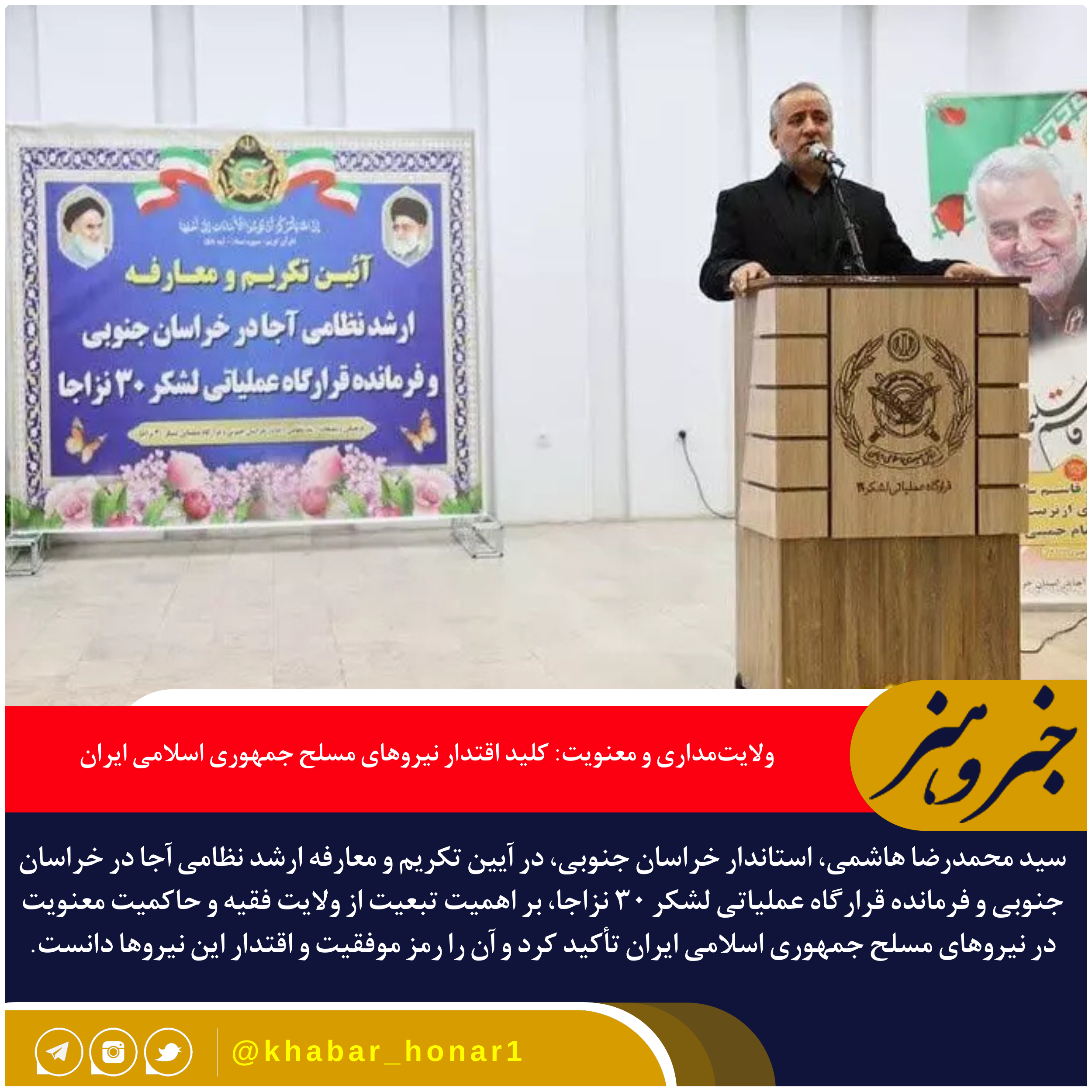 سید محمدرضا هاشمی، استاندار خراسان جنوبی، در آیین تکریم و معارفه ارشد نظامی آجا در خراسان جنوبی و فرمانده قرارگاه عملیاتی لشکر ۳۰ نزاجا، بر اهمیت تبعیت از ولایت فقیه و حاکمیت معنویت در نیروهای مسلح جمهوری اسلامی ایران تأکید کرد و آن را رمز موفقیت و اقتدار این نیروها دانست.