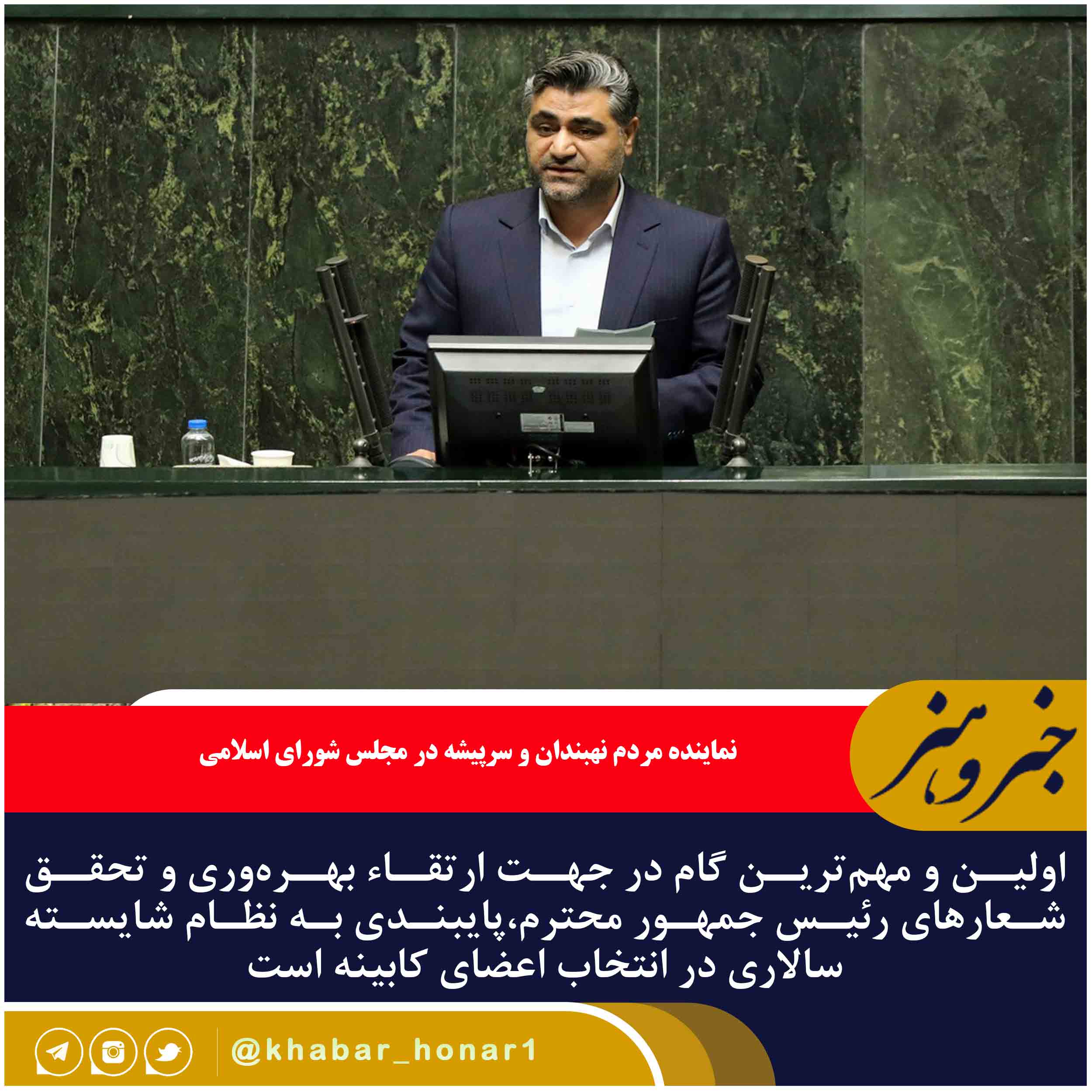 نماینده مردم نهبندان و سرپیشه در مجلس شورای اسلامی در نطق میان دستور جلسه علنی امروز مجلس گفت:اولین و مهمترین گام در جهت ارتقاء بهرهوری و تحقق شعارهای رئیس جمهور محترم،پایبندی به نظام شایسته سالاری در انتخاب اعضای کابینه است.