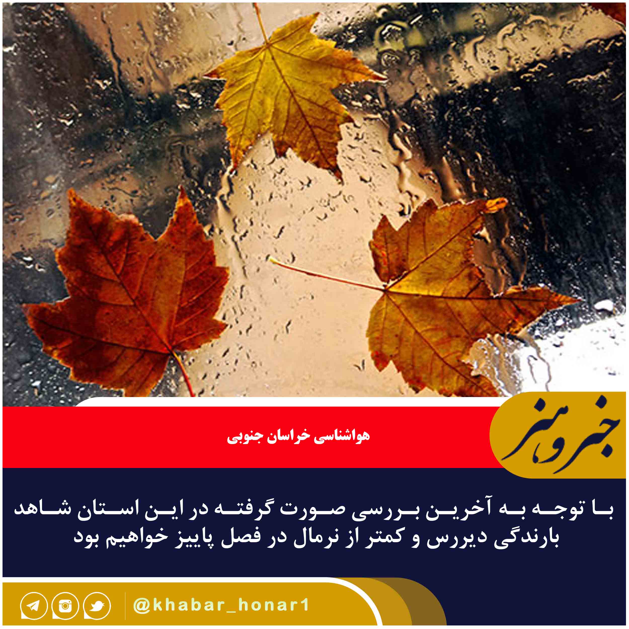 رئیس اداره پیشبینی و مدیریت بحران مخاطرات وضع هوا اداره کل هواشناسی خراسان جنوبی بیان کرد: میانگین بارندگی نرمال فصل پاییز در خراسان جنوبی ۱۹.۶ میلیمتر است.