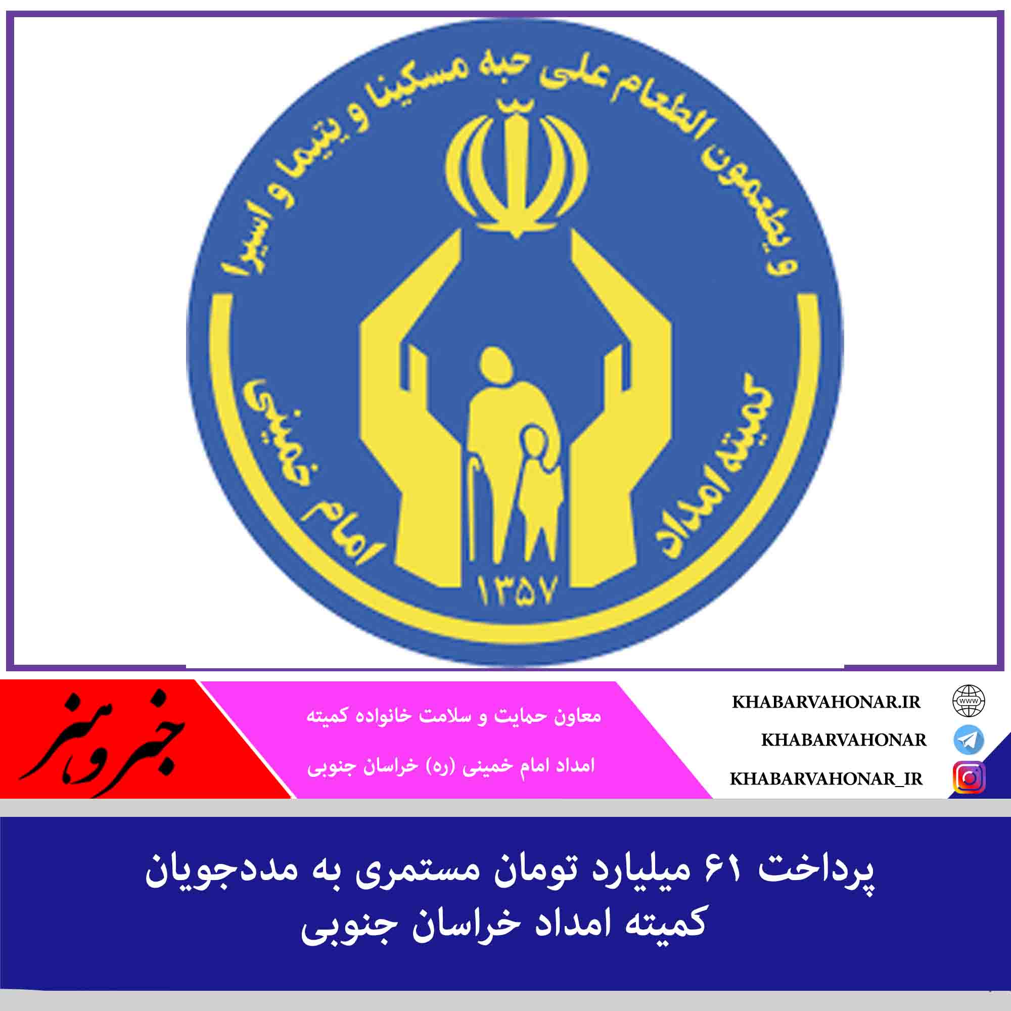 معاون حمایت و سلامت خانواده کمیته امداد امام خمینی (ره) خراسان جنوبی گفت: در سه ماه نخست سال جاری ۶۱ میلیارد تومان مستمری به مددجویان زیرپوشش کمیته امداد استان پرداخت شده است.
