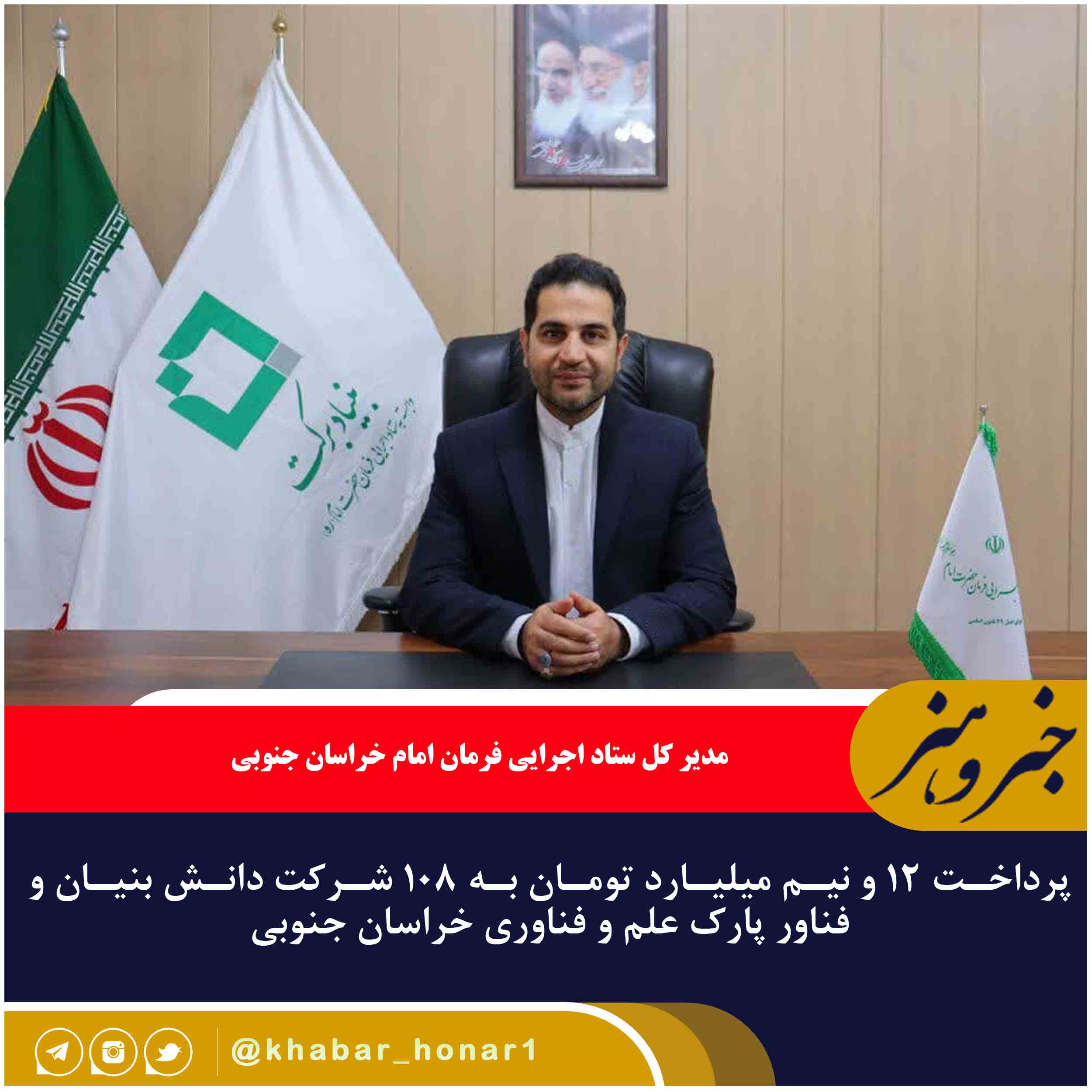 مدیر کل ستاد اجرایی فرمان حضرت امام (ره) خراسان جنوبی از پرداخت ۱۲ و نیم میلیارد تومان به ۱۰۸ شرکت دانش بنیان و فناور پارک علم و فناوری خراسان جنوبی خبر داد. سید مجتبی موسوی از تعدادی ازشرکت های فناور مستقر در ساختمان شماره ۲ پارک علم و فناوری خراسان جنوبی که توسط بنیاد برکت با پرداخت تسهیلات مورد حمایت قرار گرفته اند، بازدید کرد. در این بازدید که دکتر مجیدی رئیس پارک علم و فناوری، شکری معاون فرماندارشهرستان بیرجند و مهدی راستگو معاون اشتغال اداره کل تعاون، کار و رفاه اجتماعی استان هم حضور داشتند از تعدادی از شرکت های فناور مستقر در ساختمان شماره ۲ پارک علم و فناوری خراسان جنوبی که در زمینه های تولید دستگاه های سورتینگ عناب، خشک کن میوه، رفع گیر از لوله های فاظلاب، تنظیف پنل های خورشیدی، گاز دار کردن نوشابه های خانگی ، تولید مضراب های سنتور و لوازم موسیقی و چاپ پارچه و باتیک فعالیت می کنند، بازدید کرد.