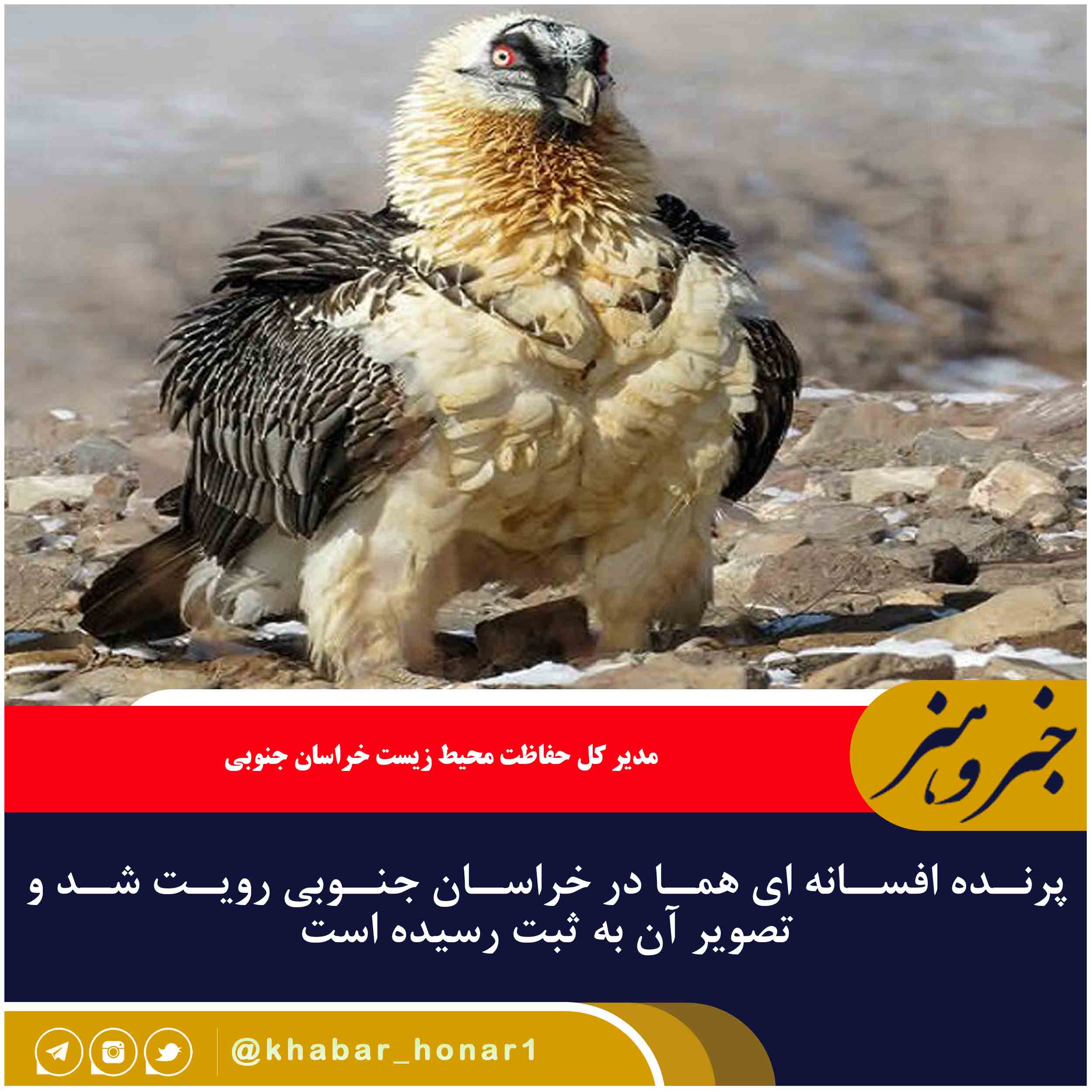مدیر کل حفاظت محیط زیست خراسان جنوبی گفت: پرنده افسانه ای هما در خراسان جنوبی رویت شد و تصویر آن به ثبت رسیده است.