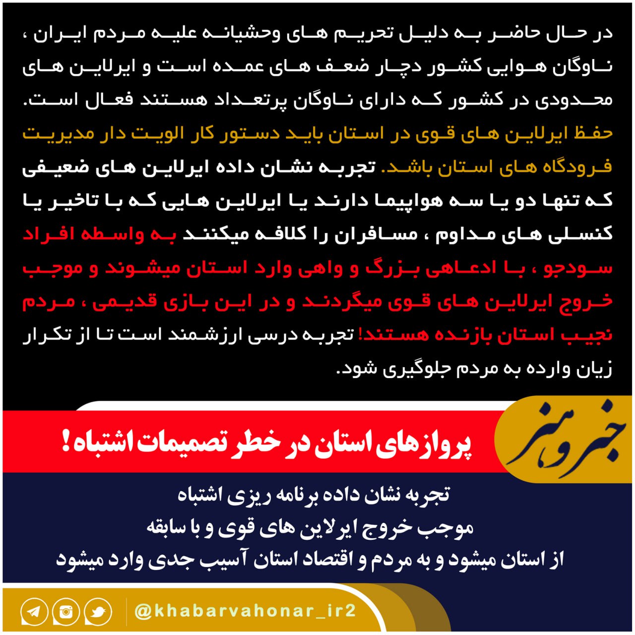 تجربه نشان داده برنامه ریزی اشتباه، موجب خروج ایرلاین های قوی و با سابقه از استان میشود و به مردم و اقتصاد استان آسیب جدی وارد میشود.