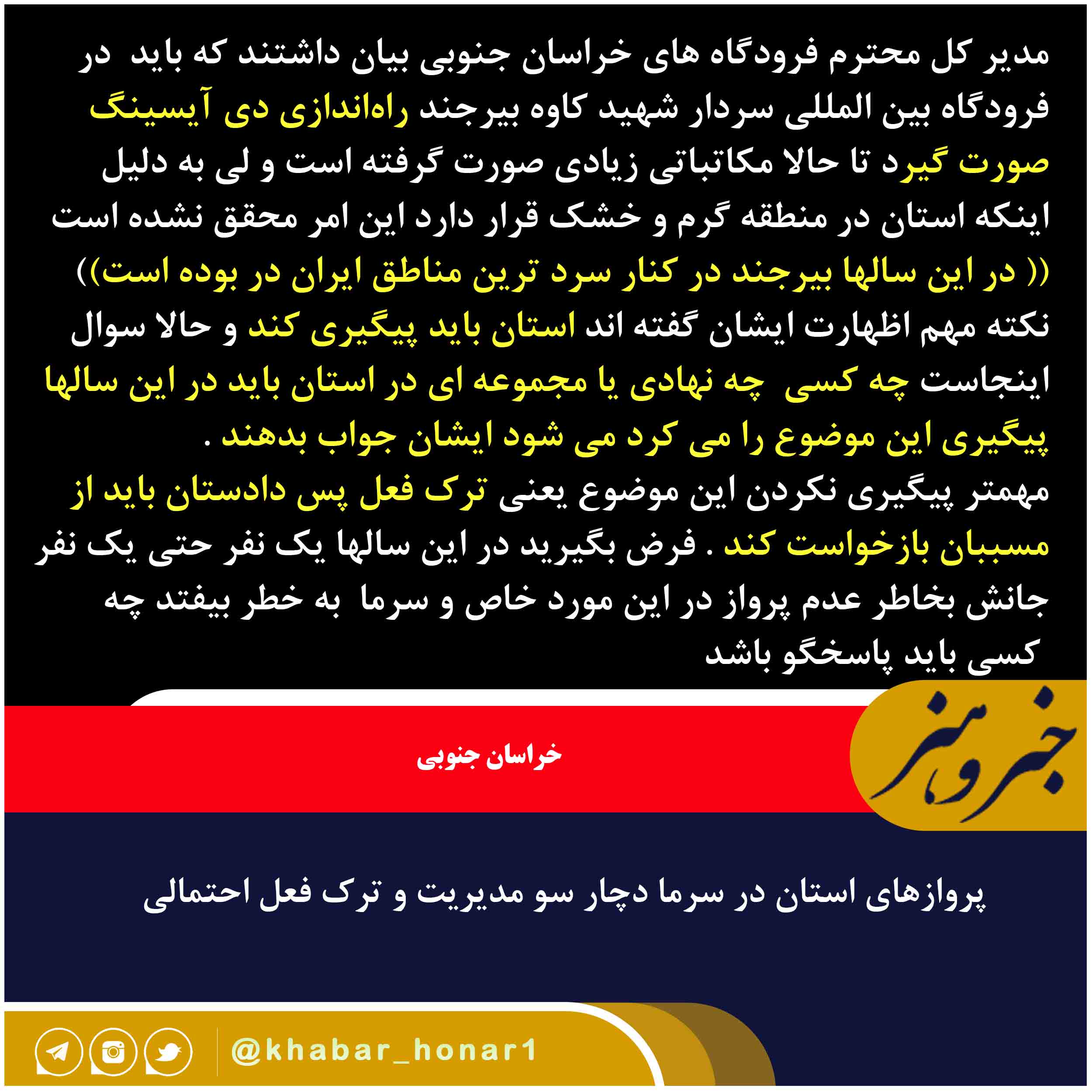 مدیر کل محترم فرودگاه های خراسان جنوبی بیان داشتند که باید در فرودگاه بین المللی سردار شهید کاوه بیرجند راهاندازی دی آیسینگ صورت گیرد تا حالا مکاتباتی زیادی صورت گرفته است و لی به دلیل اینکه استان در منطقه گرم و خشک قرار دارد این امر محقق نشده است (( در این سالها بیرجند در کنار سرد ترین مناطق ایران در بوده است)) نکته مهم اظهارت ایشان گفته اند استان باید پیگیری کند و حالا سوال اینجاست چه کسی چه نهادی یا مجموعه ای در استان باید در این سالها پیگیری این موضوع را می کرد می شود ایشان جواب بدهند . مهمتر پیگیری نکردن این موضوع یعنی ترک فعل پس دادستان باید از مسببان بازخواست کند . فرض بگیرید در این سالها یک نفر حتی یک نفر جانش بخاطر عدم پرواز در این مورد خاص و سرما به خطر بیفتد چه کسی باید پاسخگو باشد