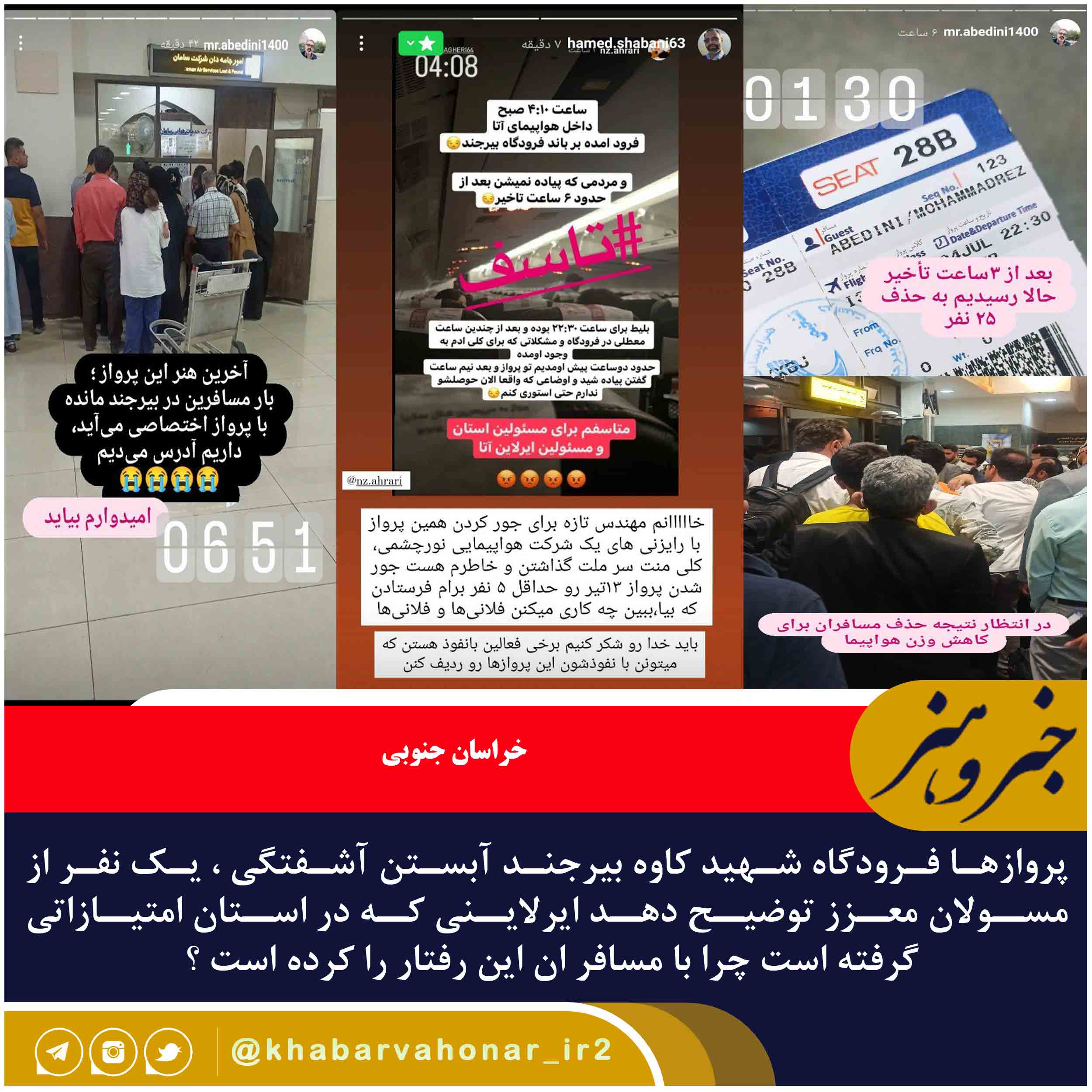 پروازها فرودگاه شهید کاوه بیرجند آبستن آشفتگی ، یک نفر از مسولان معزز توضیح دهد ایرلاینی که در استان امتیازاتی گرفته است چرا با مسافر ان این رفتار را کرده است ؟