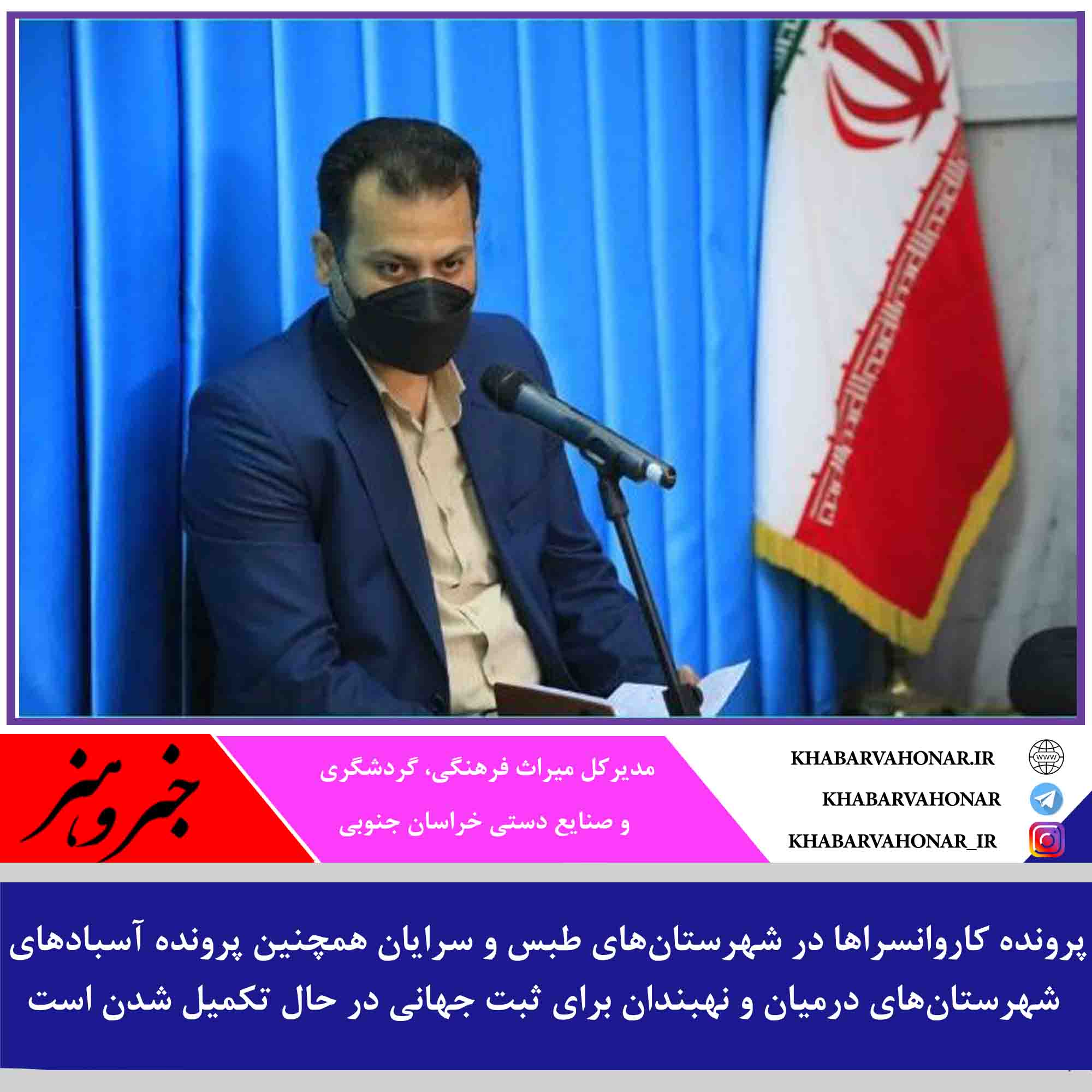 مدیرکل میراث فرهنگی، گردشگری و صنایع دستی خراسان جنوبی گفت: پرونده کاروانسراها در شهرستانهای طبس و سرایان همچنین پرونده آسبادهای شهرستانهای درمیان و نهبندان برای ثبت جهانی در حال تکمیل شدن است.