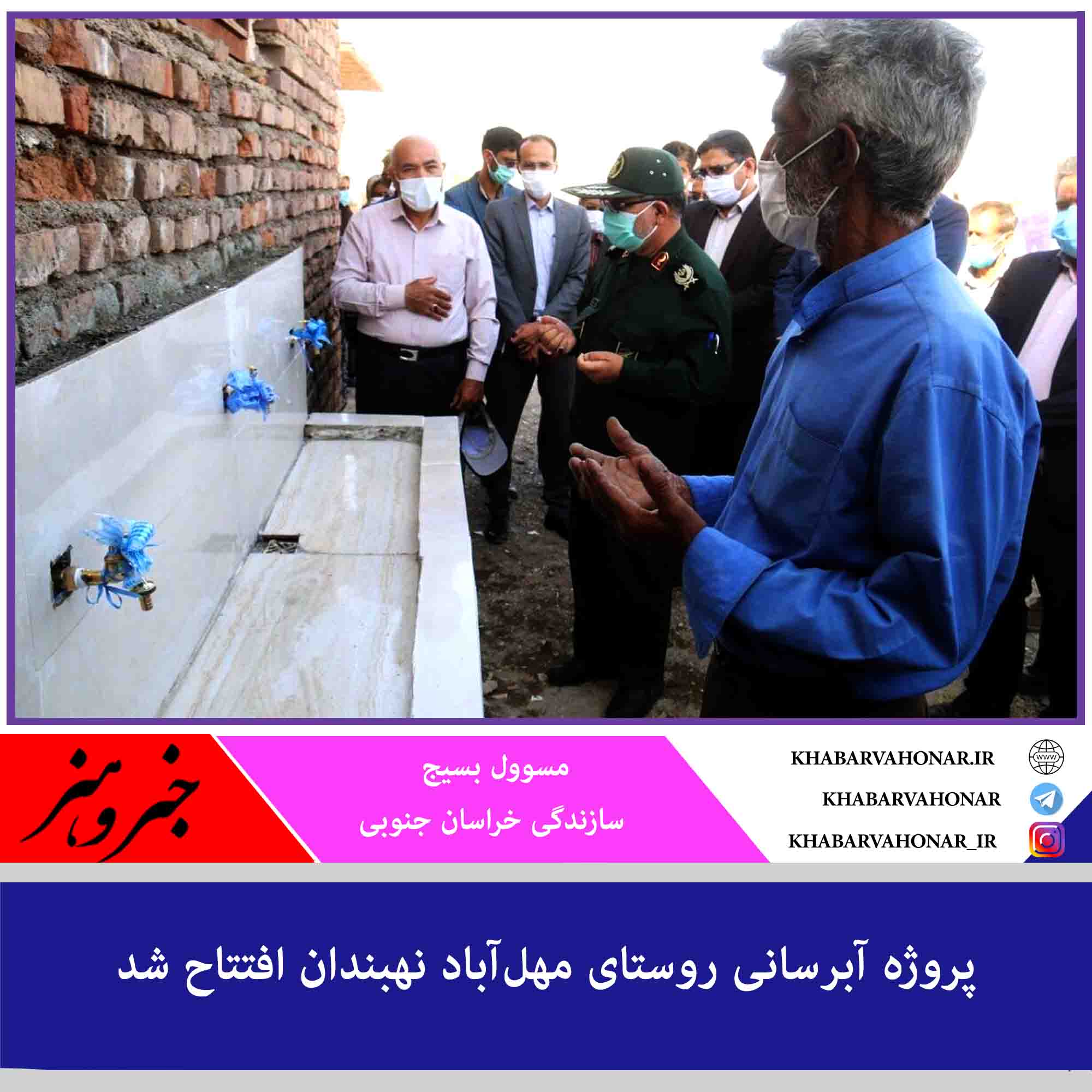 پروژه آبرسانی روستای مهلآباد نهبندان با هزینه کرد ۸۰۰ میلیون تومان و مشارکت سازمان بسیج سازندگی، حمایت خیران و مشارکت شرکت آب و فاضلاب خراسان جنوبی به بهرهبرداری رسید.