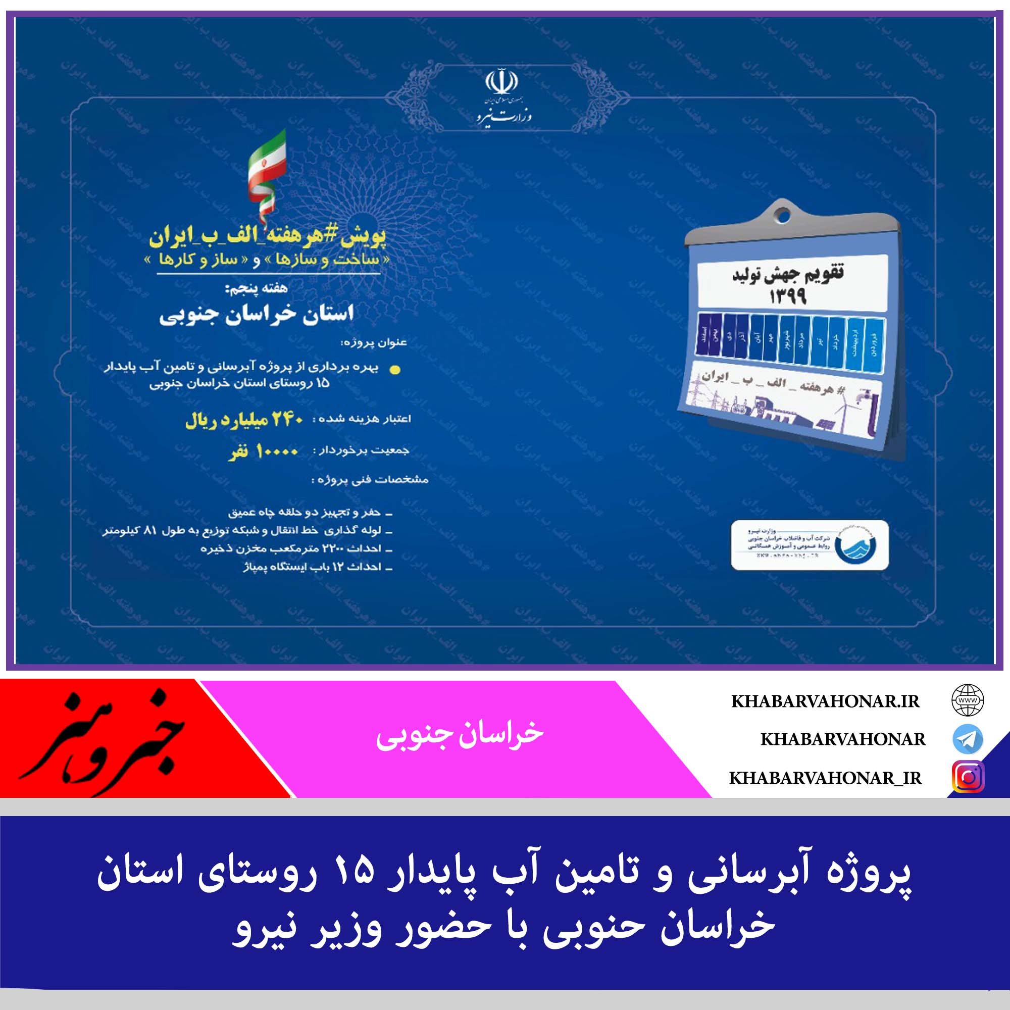 در پنجمین هفته از پویش هر هفته _الف_ب_ایران پروژه آبرسانی و تامین آب پایدار ۱۵ روستای استان خراسان حنوبی با اعتبار ۲۴۰ میلیارد ریال با حضور وزیر نیرو فردا شنبه ۱۰ خرداد به بهره برداری می رسد.