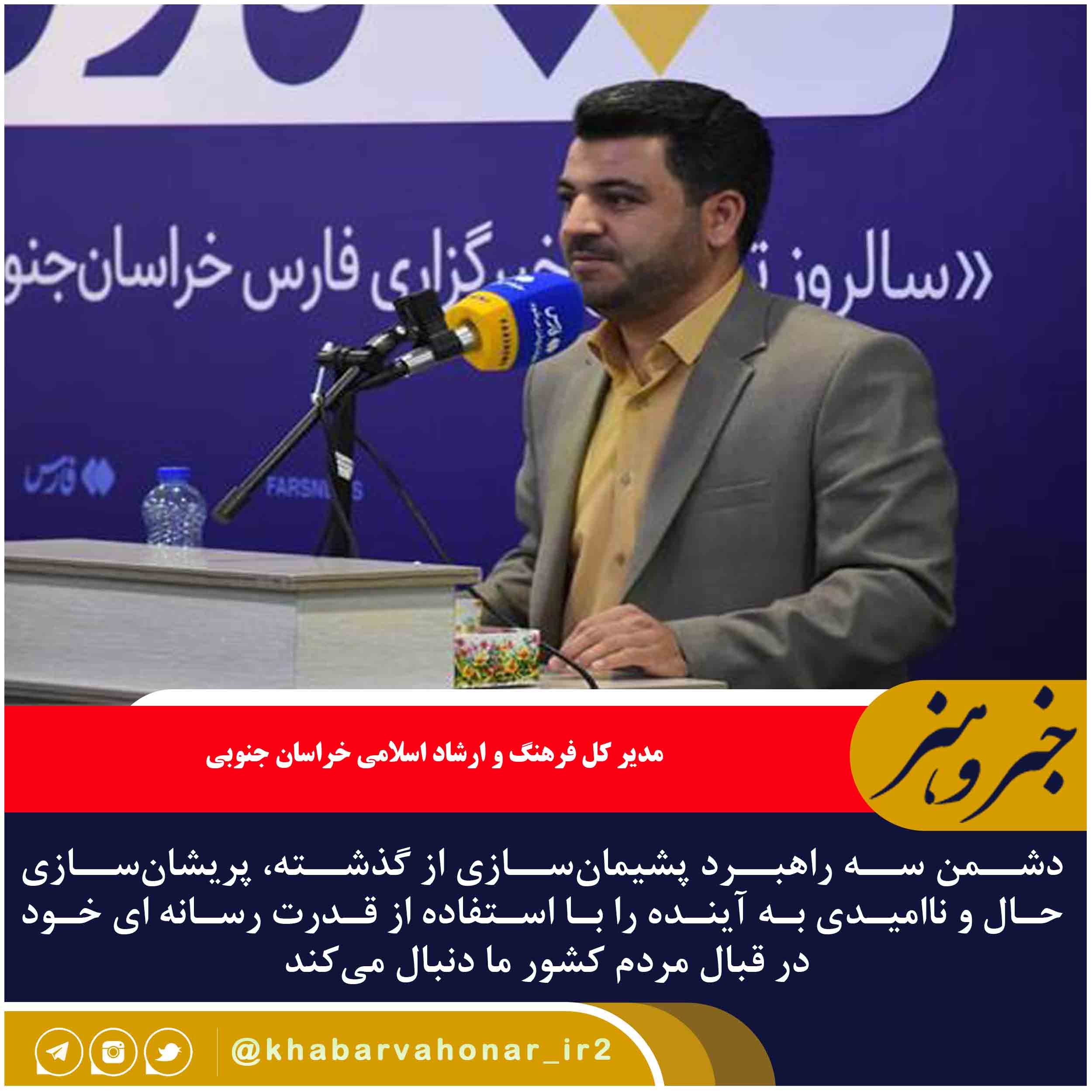 مدیر کل فرهنگ و ارشاد اسلامی خراسان جنوبی گفت: دشمن سه راهبرد پشیمان‌سازی از گذشته، پریشان‌سازی حال و ناامیدی به آینده را با استفاده از قدرت رسانه ای خود در قبال مردم کشور ما دنبال می‌کند.