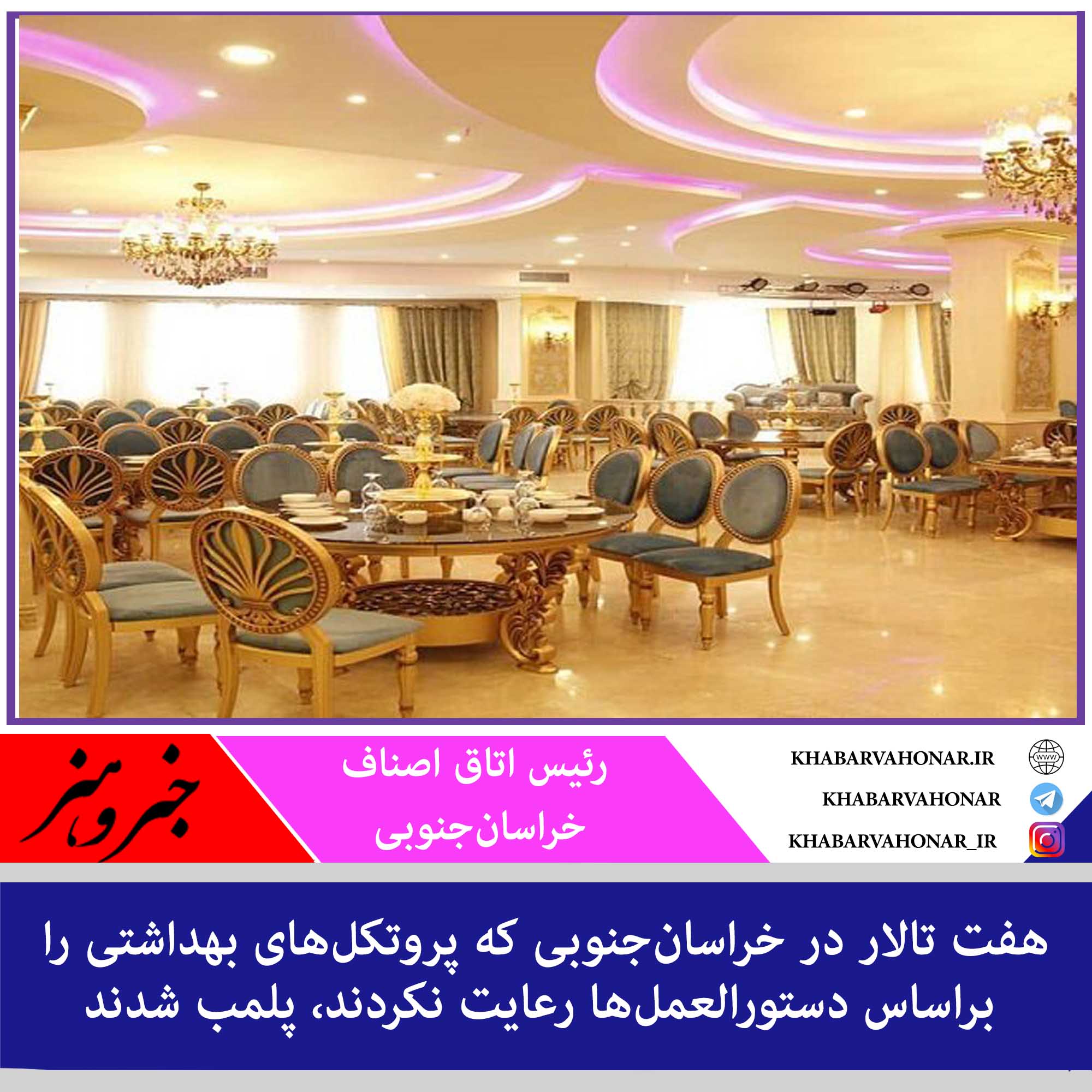 رئیس اتاق اصناف خراسانجنوبی گفت: براساس گزارش دانشگاه علوم پزشکی بیرجند، هفت تالار در خراسانجنوبی که پروتکلهای بهداشتی را براساس دستورالعملها رعایت نکردند، پلمب شدند.