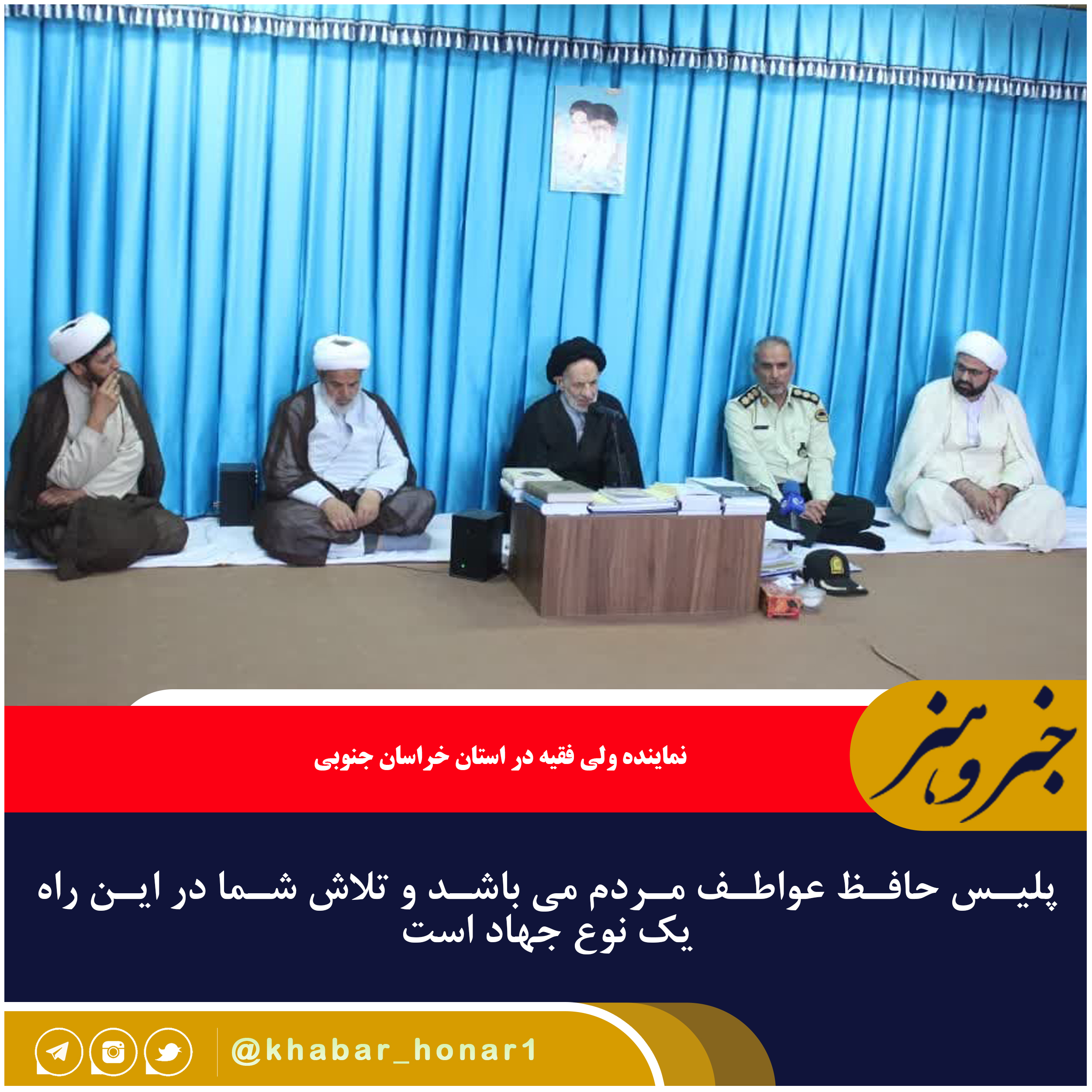نماینده ولی فقیه در استان خراسان جنوبی گفت: پلیس مقتدر و امین جمهوری اسلامی حافظ عواطف مردم بوده و مسئولیت های زیادی بر دوش دارد .