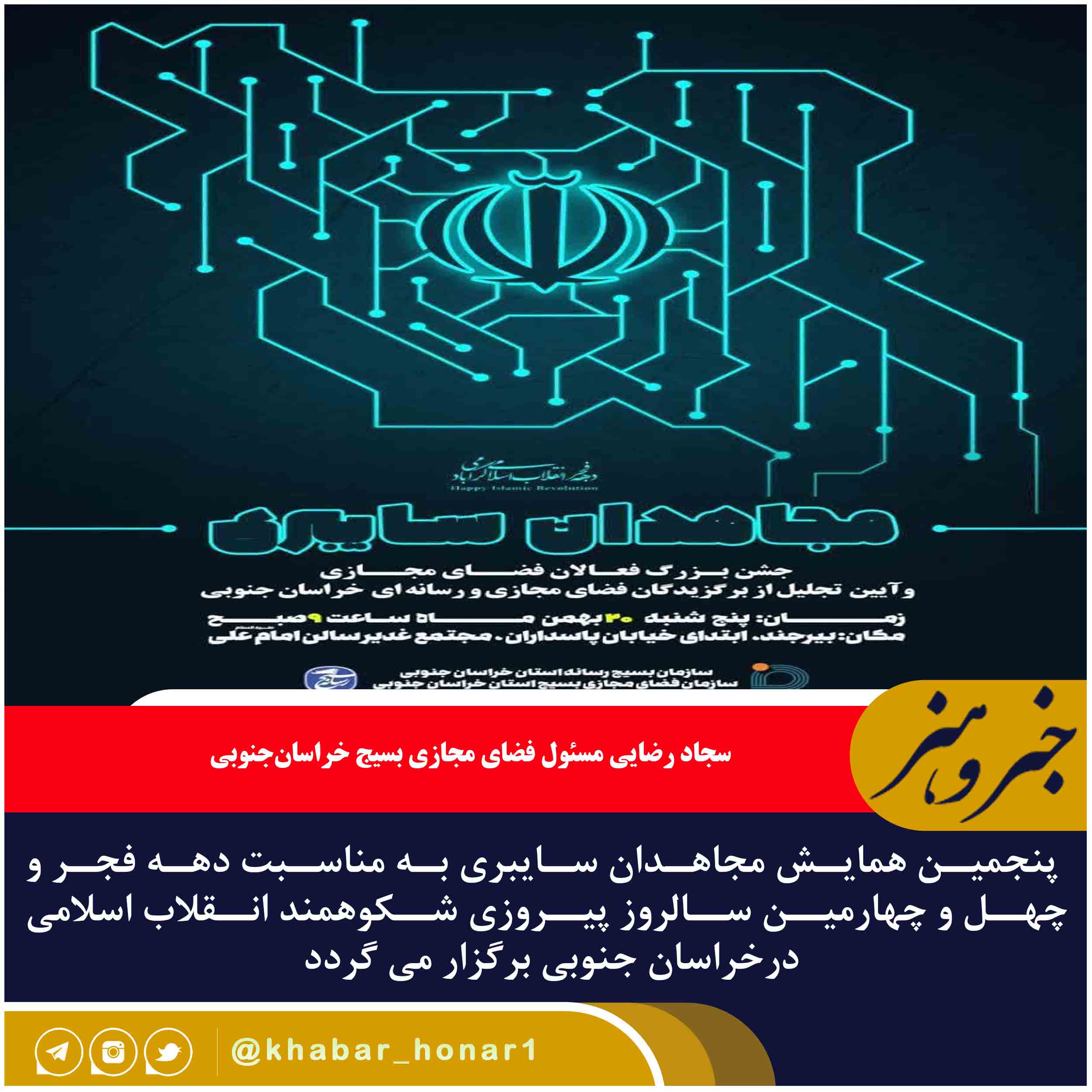 سجاد رضایی مسئول فضای مجازی بسیج خراسانجنوبی در جمع خبرنگاران اظهار کرد: پنجمین همایش مجاهدان سایبری به مناسبت دهه فجر و چهل و چهارمین سالروز پیروزی شکوهمند انقلاب اسلامی با حضور جمعی از برگزیدگان و برترینهای فضای مجازی، مدیران حوزه فرهنگ، رسانه و فضای مجازی روز پنجشنبه ۲۰ بهمن ماه ساعت ۹ صبح در مجتمع غدیر بیرجند برگزار خواهد شد.
