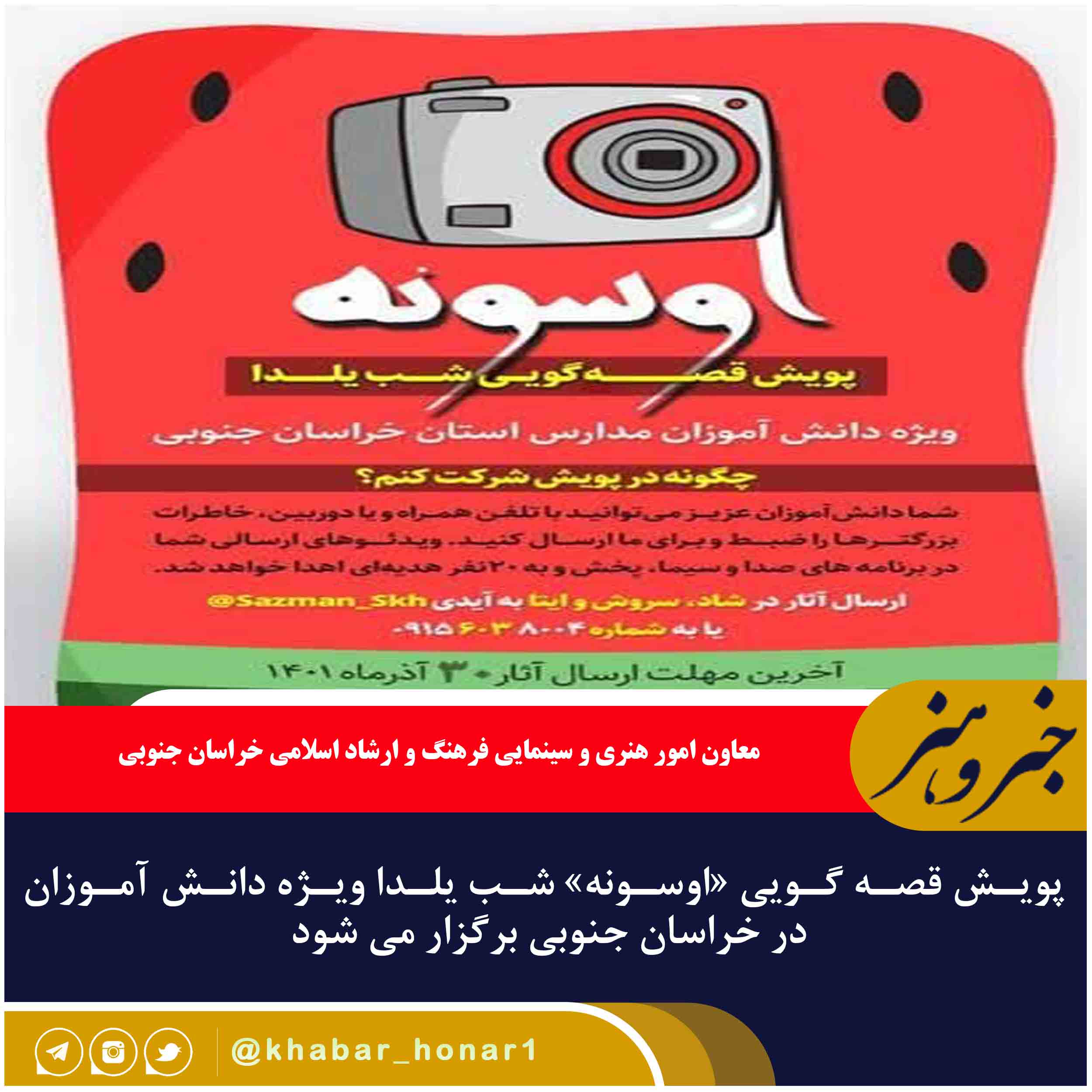 معاون امور هنری و سینمایی فرهنگ و ارشاد اسلامی خراسان جنوبی از برگزاری پویش قصه گویی شب یلدا با عنوان «اوسونه» به همت این اداره کل ویژه دانش آموزان در استان خبر داد.