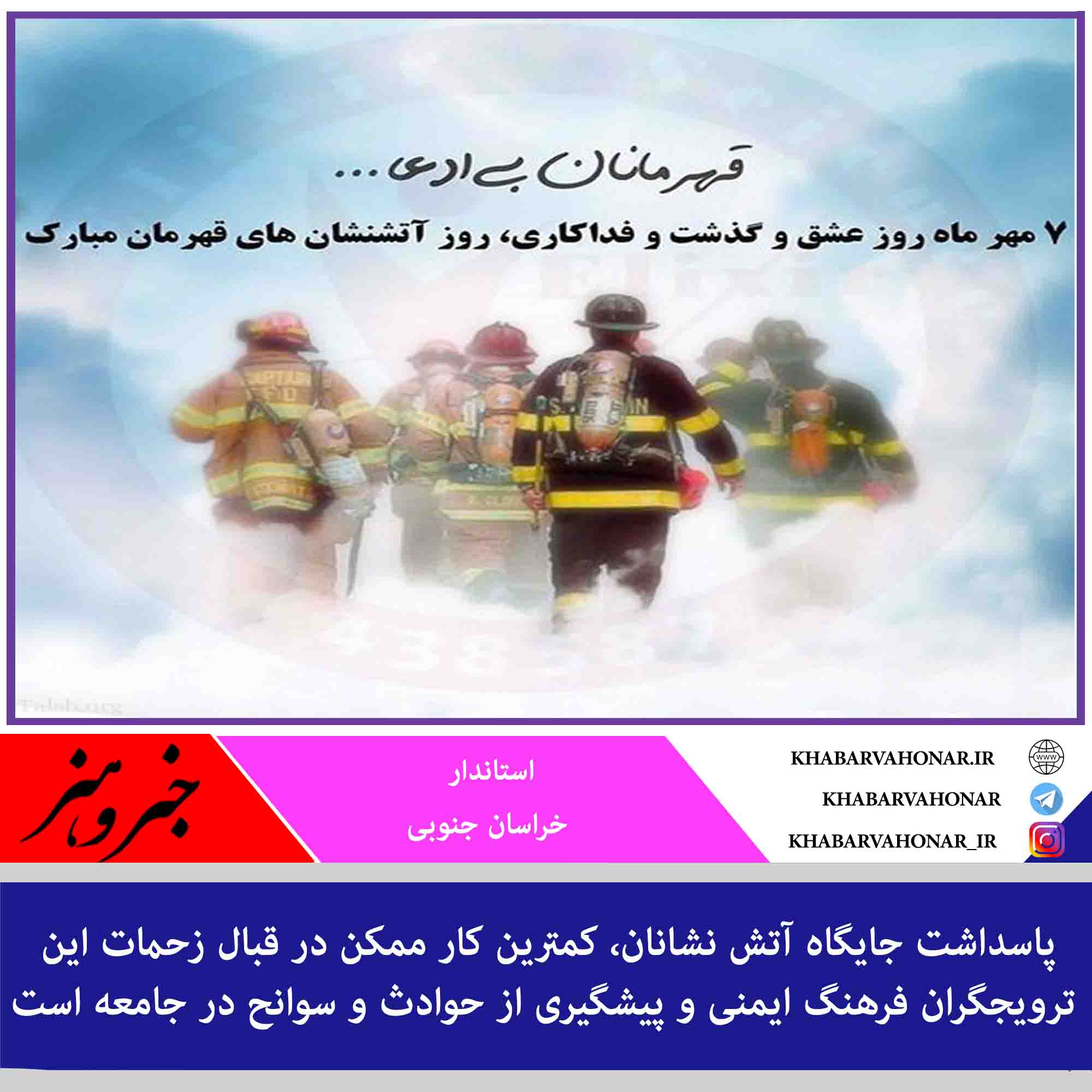 ?اینجانب ضمن تقدیر و تشکر از خدمات شبانه روزی و زحمات مخلصانه کلیه آتش نشانان خدوم و زحمتکش کشور به ویژه در خراسان جنوبی، هفتم مهرماه روز آتش نشانی و ایمنی را صمیمانه به این عزیزان تبریک و تهنیت عرض نموده، با آرزوی سلامتی و توفیق در عمل برای همه این عزیزان، از درگاه ایزد منان، روزهایی بدون حادثه را برای عموم مردم استان آرزومندم.