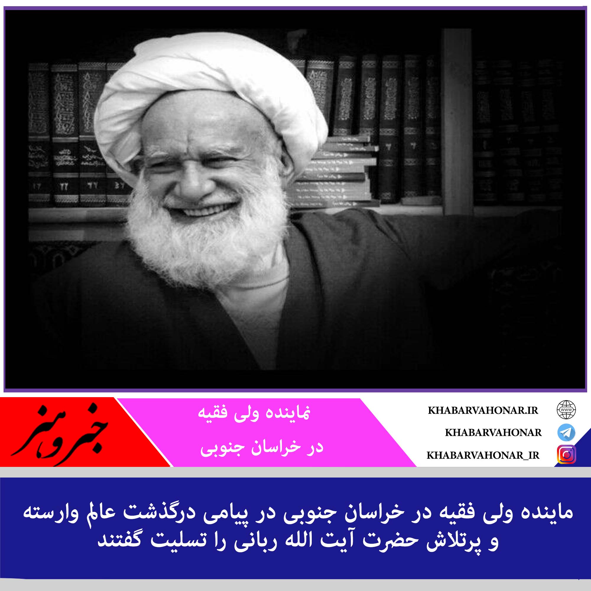نماینده ولی فقیه در خراسان جنوبی در پیامی درگذشت عالم وارسته و پرتلاش حضرت آیت الله ربانی را تسلیت گفتند.