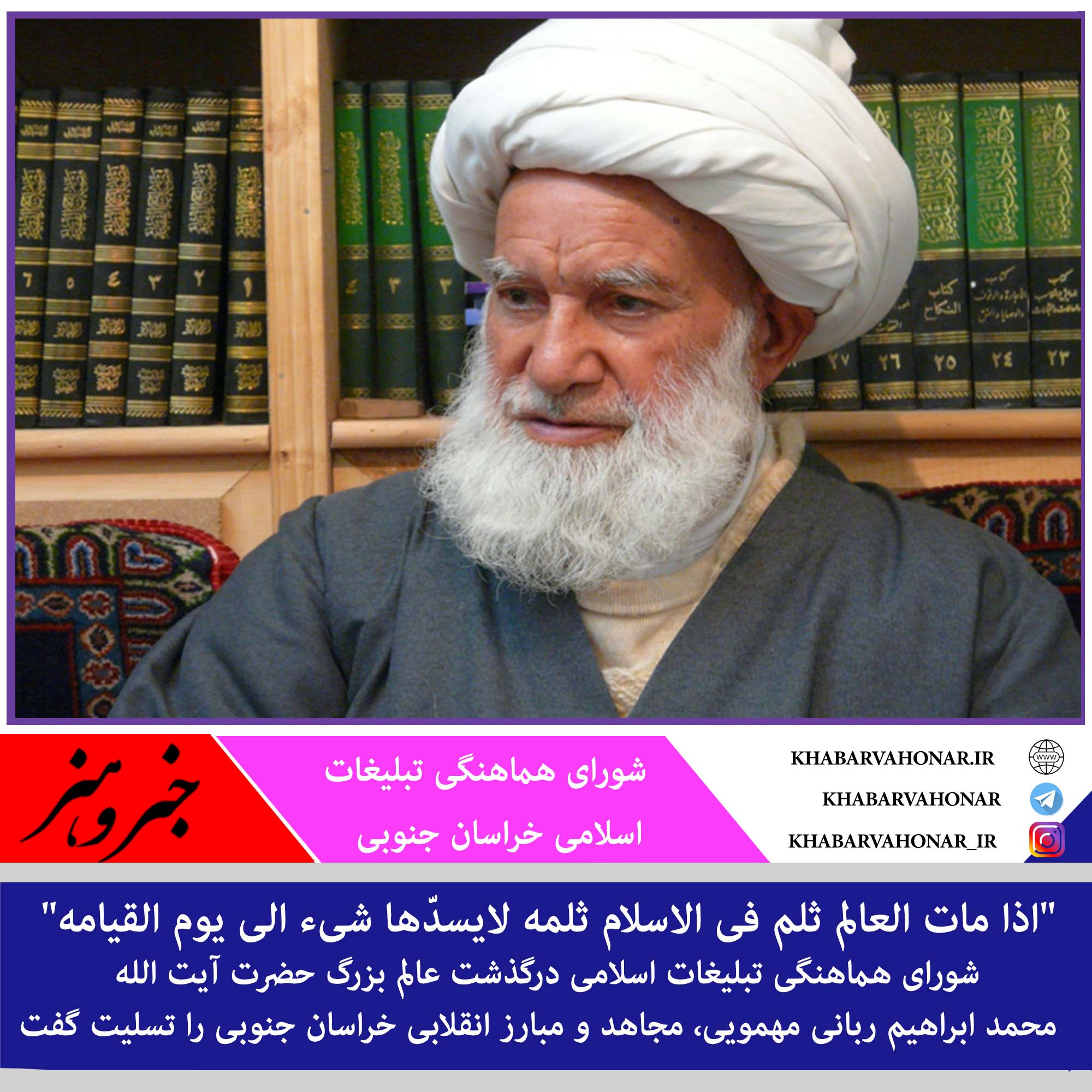 ☑️خبر درگذشت عالم بزرگ حضرت آیت الله محمد ابراهیم ربانی مهمویی، مجاهد و مبارز انقلابی خراسان جنوبی که عمر پر برکت خود را در راه اعتلای اسلام ناب محمدی(ص)، آرمانهای امام راحل(ره) و منویات امام خامنه ای(مدظله العالی) و اهداف بلند نظام مقدس جمهوری اسلامی ایران و خدمت به مردم شریف سپری کرد و از یاران و یاوران حقیقی انقلاب اسلامی بود موجب تأثر و تأسف بسیار گردید.