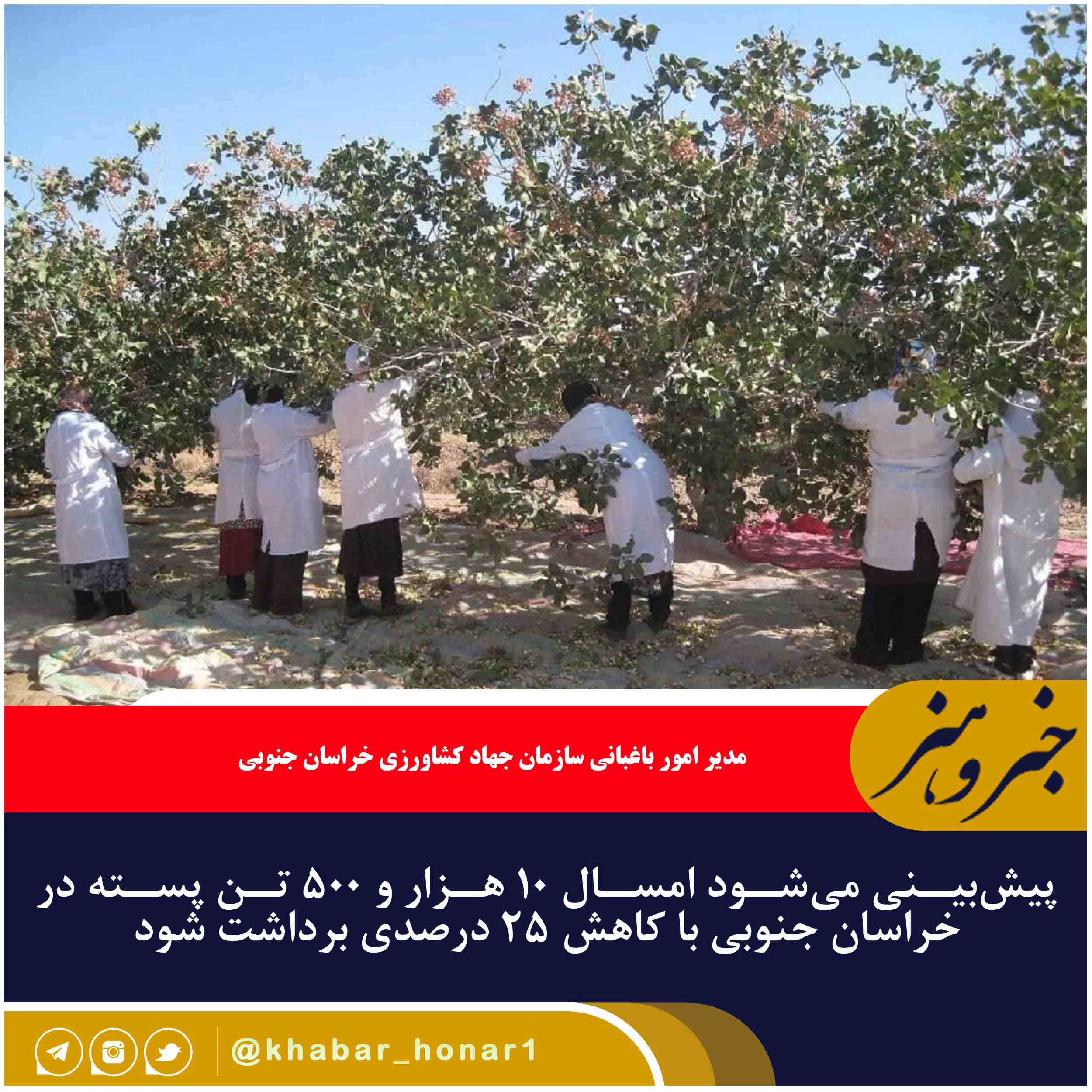 مدیر امور باغبانی سازمان جهاد کشاورزی خراسان جنوبی گفت: پیشبینی میشود امسال ۱۰ هزار و ۵۰۰ تن پسته در این استان برداشت شود که نسبت به مدت مشابه سال قبل کاهش ۲۵ درصدی دارد.