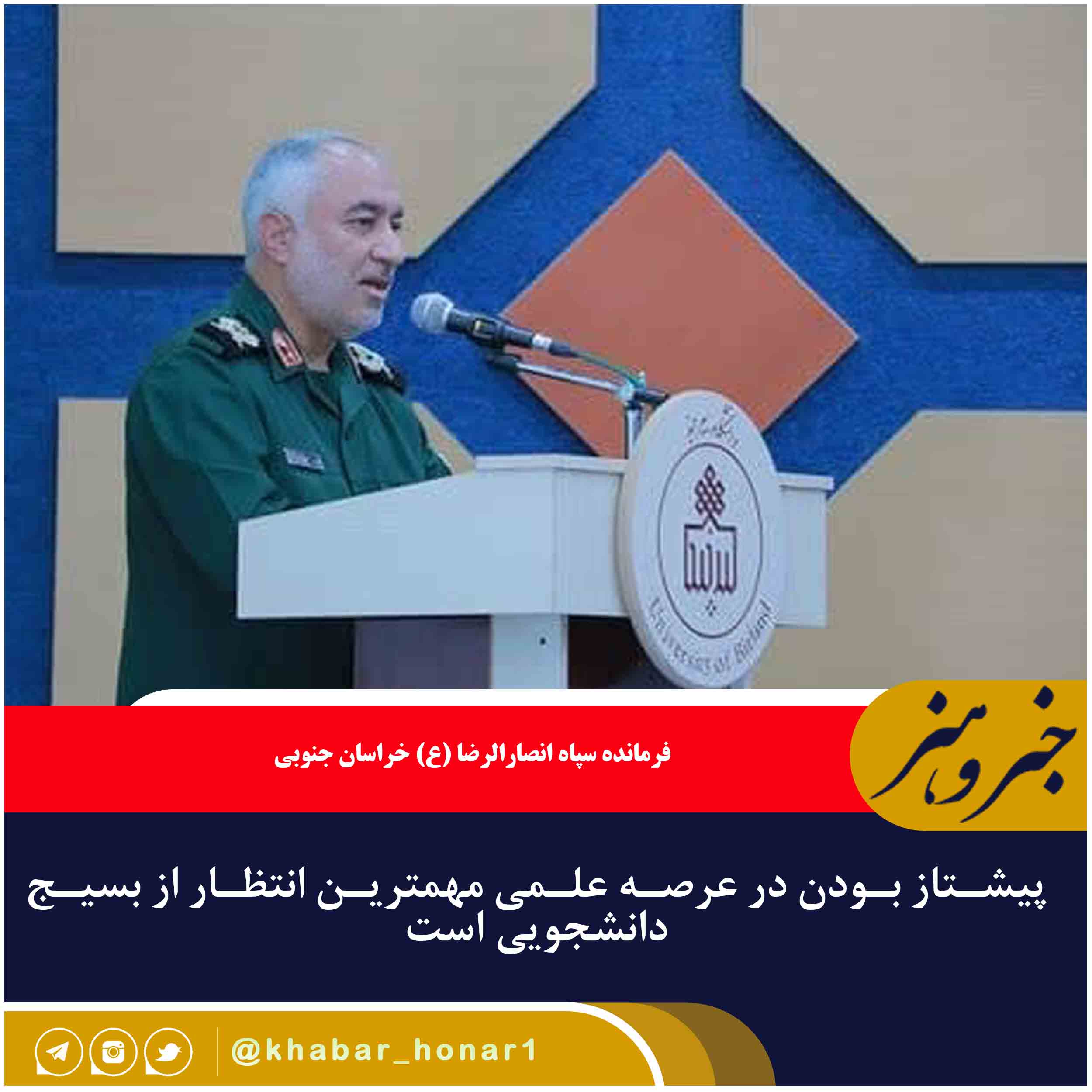 فرمانده سپاه انصارالرضا (ع) خراسان جنوبی گفت: پیشتاز بودن در عرصه علمی مهمترین انتظار از بسیج دانشجویی است و دانشجویان بسیجی باید در جهاد علمی سرآمد باشند.