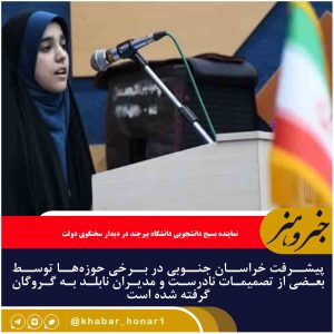 ? وی، با بیان اینکه رهبر معظم انقلاب بارها فرزندان خود را در تشکل های دانشجویی به همراه شدن با مسائل مردم توصیه کردهاند، افزود: «در خراسان جنوبی نگاه کوتهبین عدهای معدود از مسئولان خصوصا در شهرستانها، کوچکترین مطالبات تخصصی را تبدیل به مسائلی امنیتی میکنند».