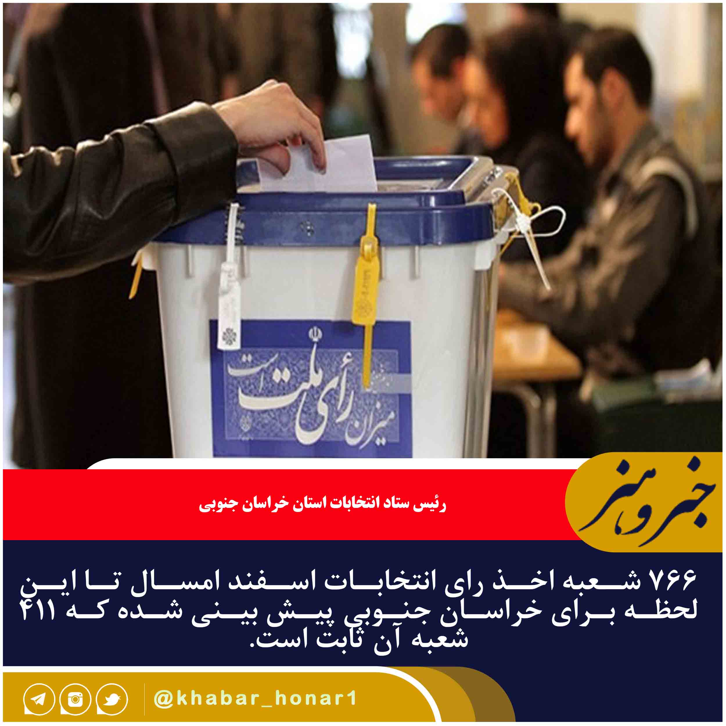 رئیس ستاد انتخابات استان خراسان جنوبی گفت: ۷۶۶ شعبه اخذ رای انتخابات اسفند امسال تا این لحظه برای خراسان جنوبی پیش بینی شده که ۴۱۱ شعبه آن ثابت است.